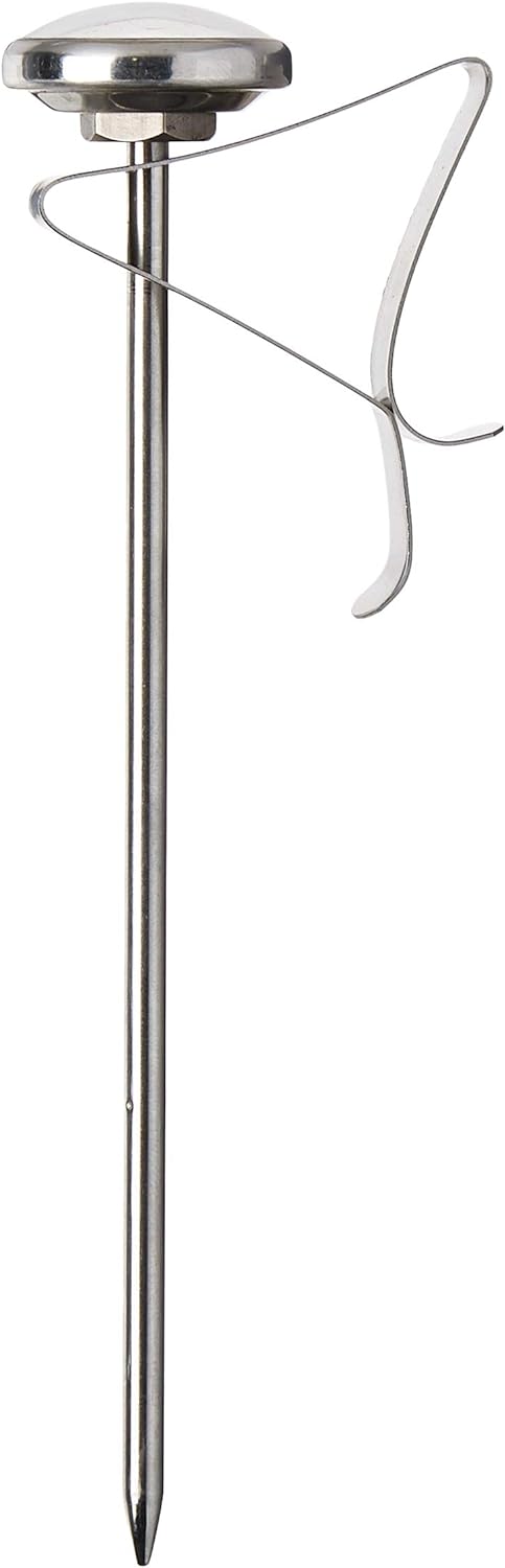 A computer-designed stainless steel clip holds the thermometer stem snuggly against any container.