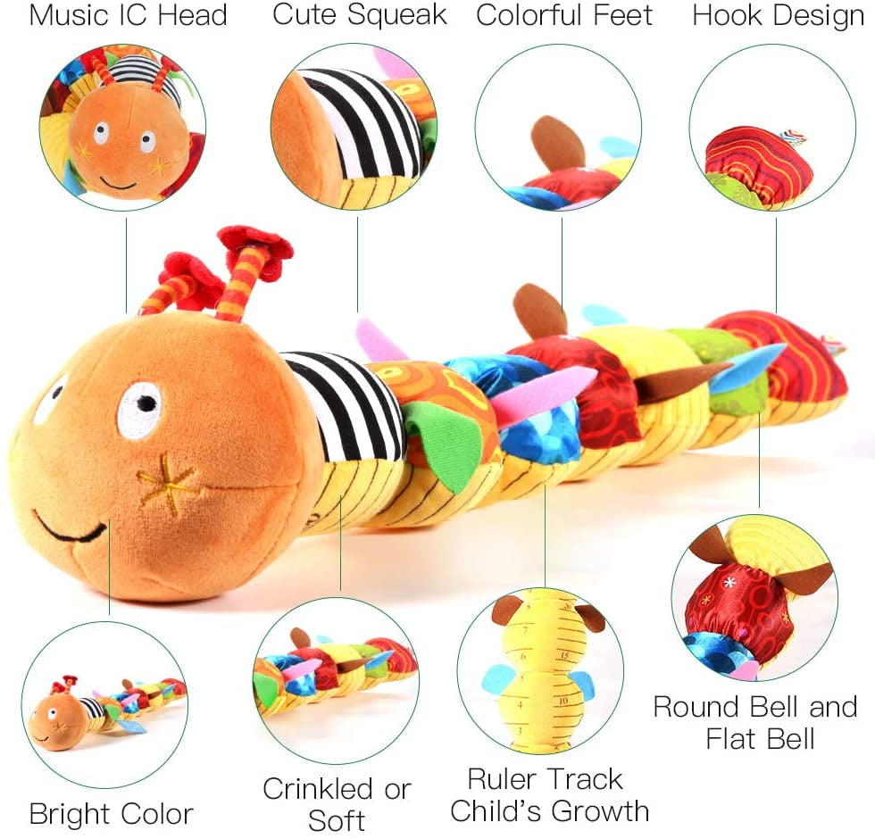 Soft of the toy has different features like the crinkle paper material, the rattle, music, the squeaker, the soft tabs, there are 6 different sensory effect fabric will never pilling As developmental toys for babies, this cute catapiller toy for your infant to add to his jungle gym of toys, great for tummy time and beyond, keeps him busy