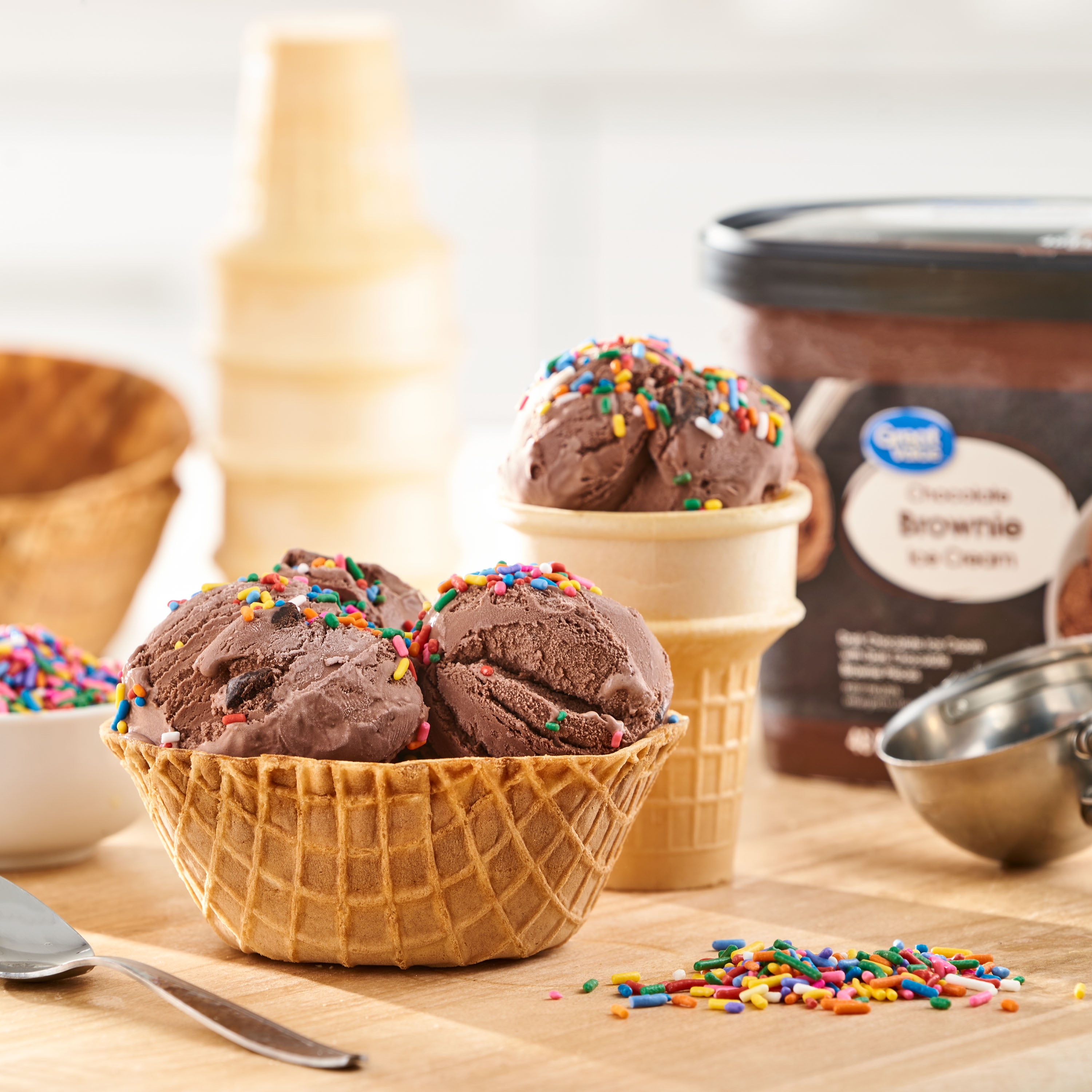 Great Value Chocolate Brownie Ice Cream is a classically delicious dessert that is a fun treat for kids and adults alike. Our chefs blended rich dark chocolate ice cream with dark chocolate brownie pieces to create a delightful treat like no other. Indulge in this sweet treat straight from the tub or scoop into a waffle cone or ice cream bowl. Enjoy it as is or top with sprinkles, syrup, almonds, whipped cream, and a maraschino cherry. This ice cream is also perfect for homemade milkshakes! Put a smile on your loved ones’ faces with a scoop of Great Value Chocolate Brownie Ice Cream.