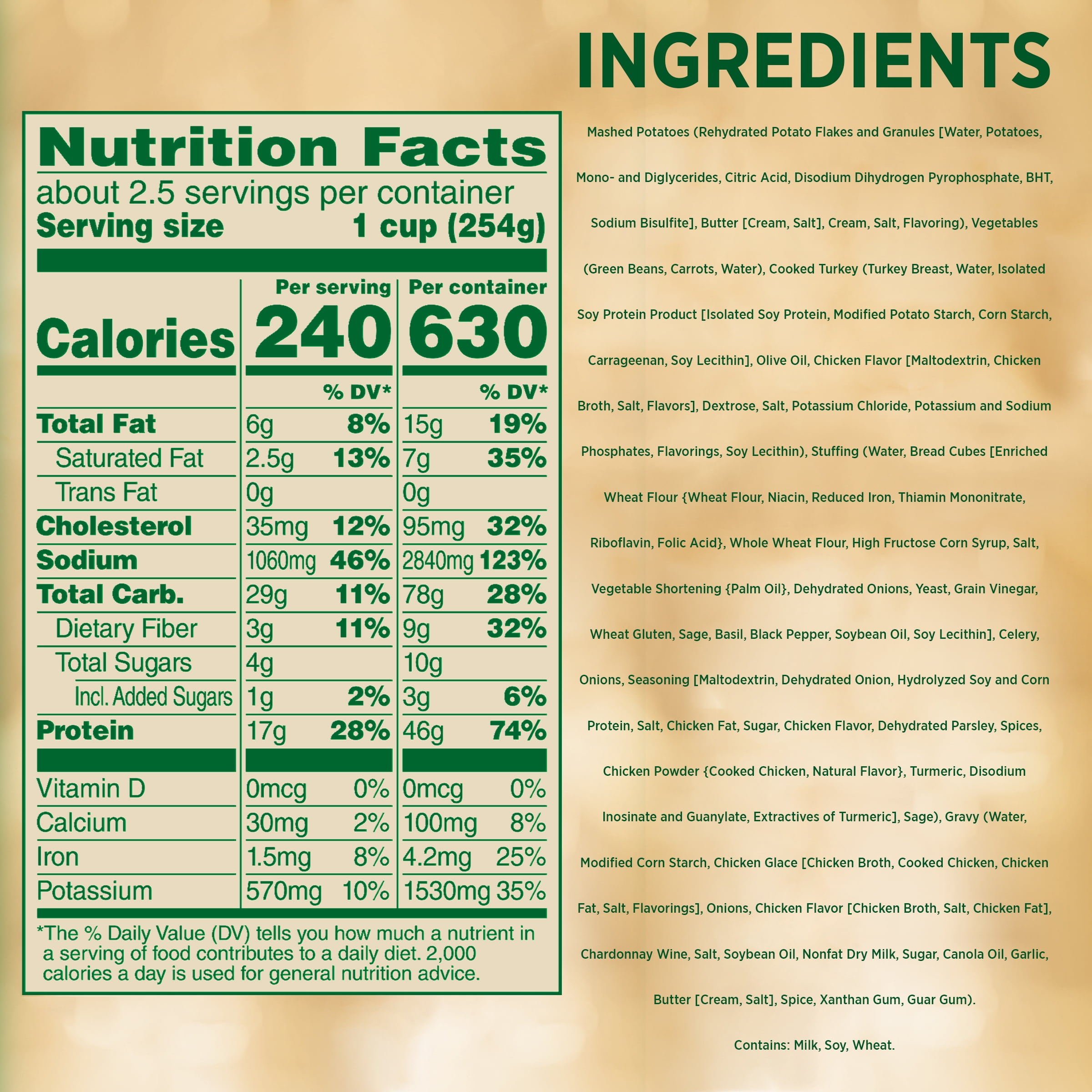 - This box contains one 24-ounce (680g) meal with two recommended servings, each with 470 calories, 0g trans fat, and 23g protein; contains milk, soy, and wheat.