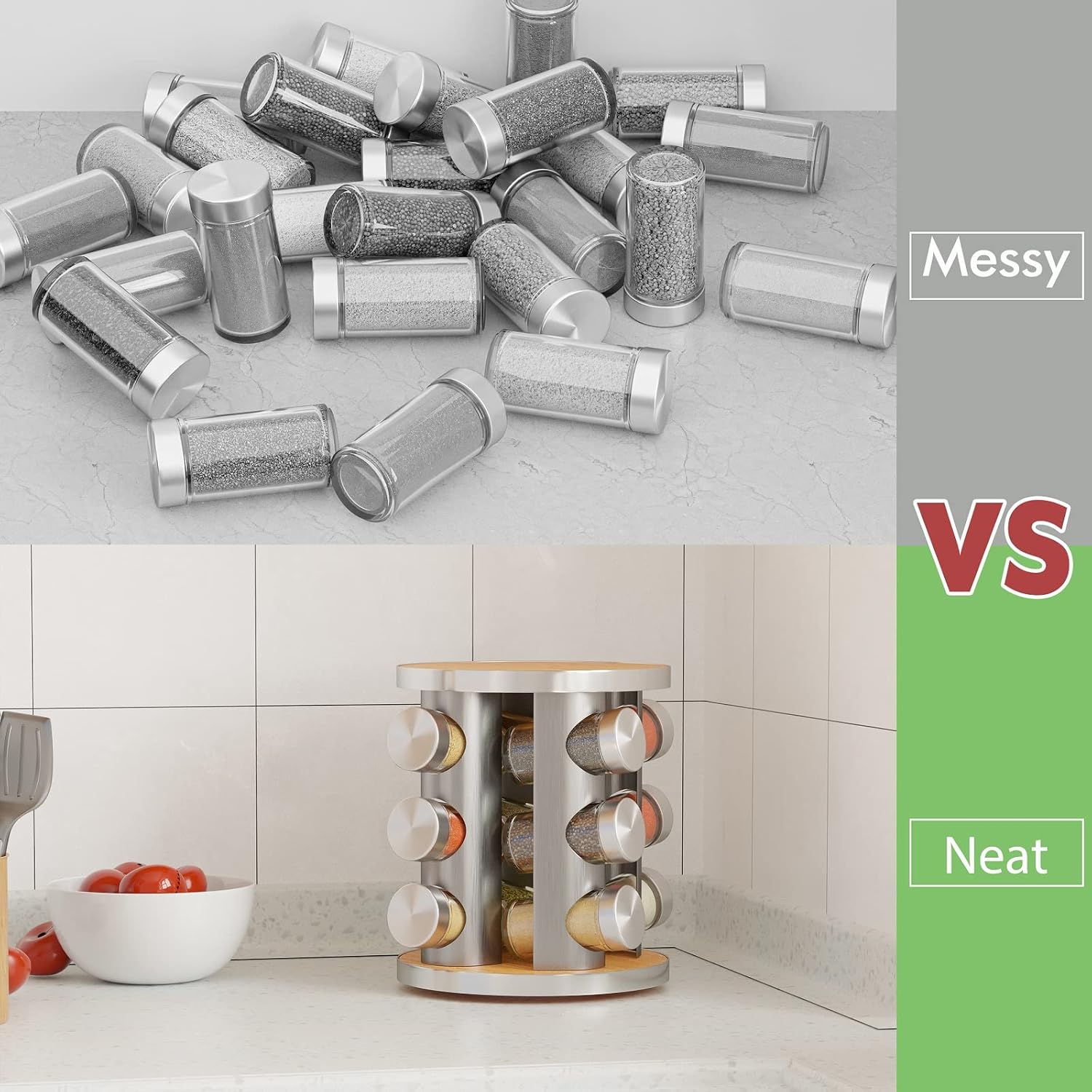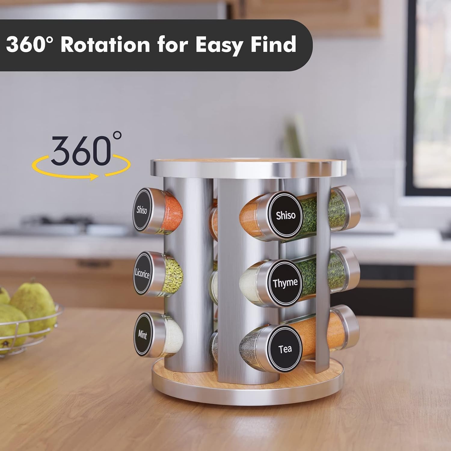 Revolving Spice Rack Set with 12 Spice Jars, Kitchen Spice Tower Organizer for Countertop or Cabinet — Carousel Storage Includes 386 Spice Labels