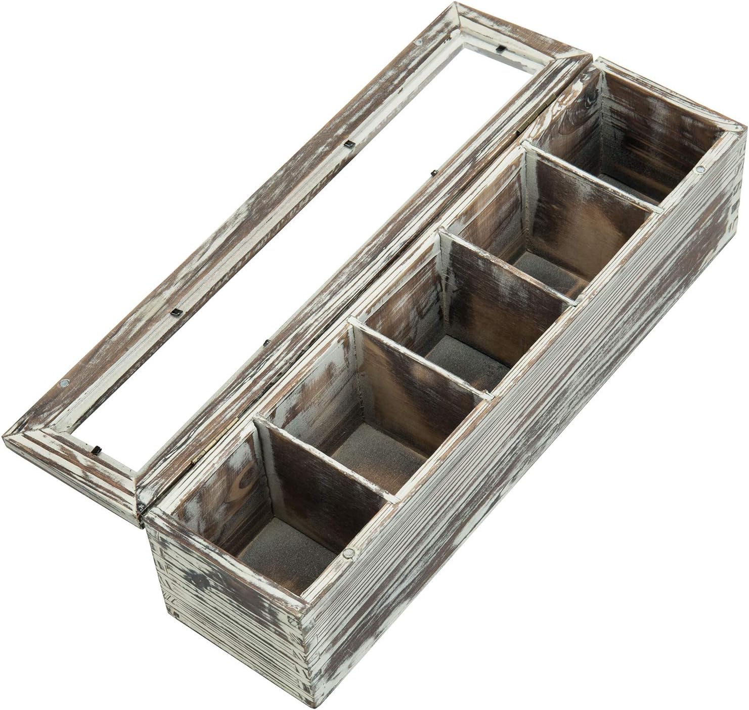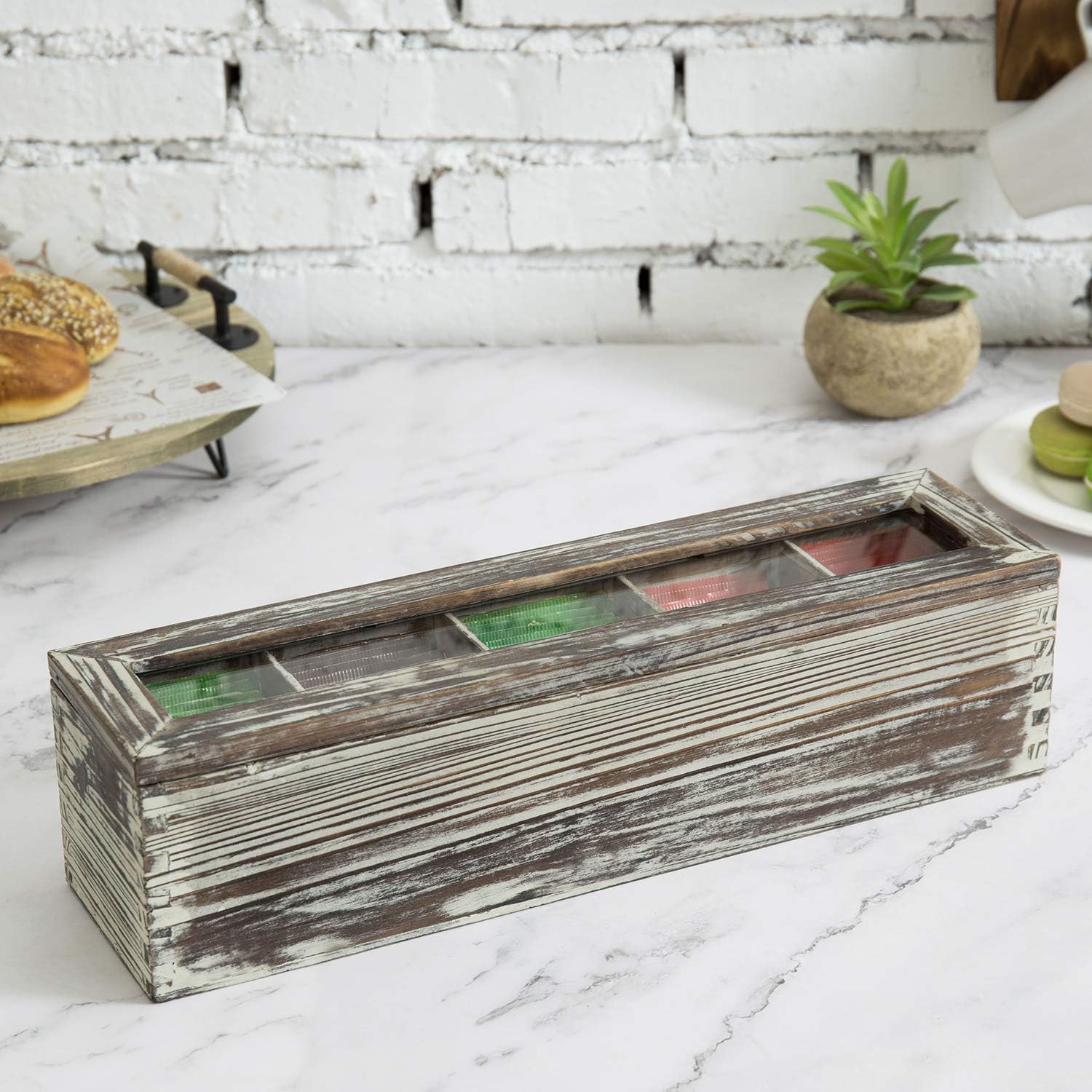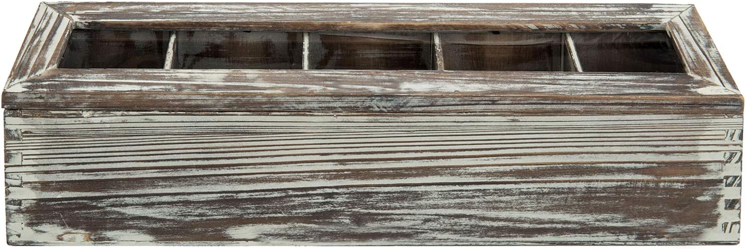 Perfectly sized to hold a small selection of tea packets, this 5 slot torched wood tea box offers a useful and decorative way to keep tea supplies, sugar packets, or coffee accessories organized on any table or counter top surface.