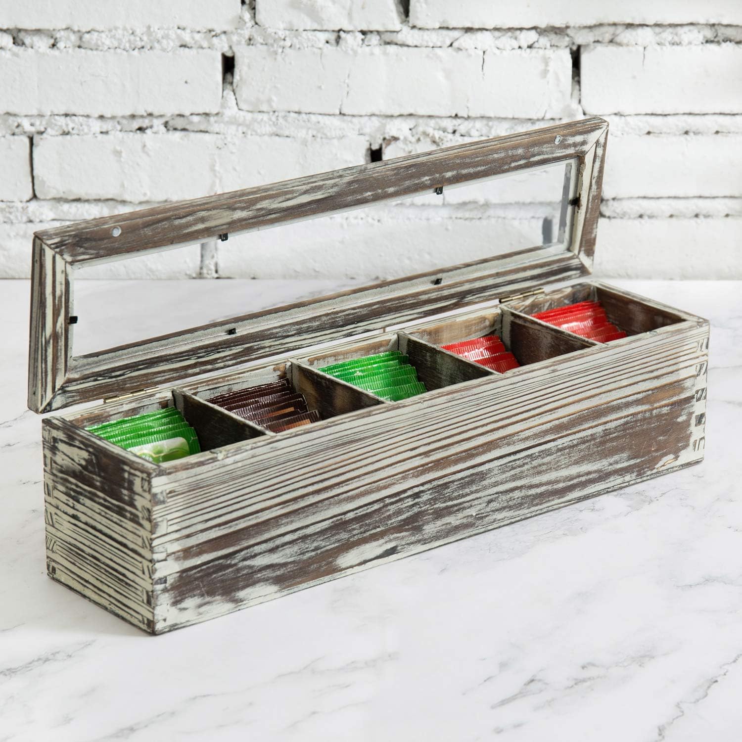 Each compartment provides sufficient pace for storing standard size packets, and its hinged magnetic clear lid easily closes and keeps its contents secured, while providing an easy view of the teas inside, making this wooden tea chest an excellent storage accessory for any kitchen or office break room setting.