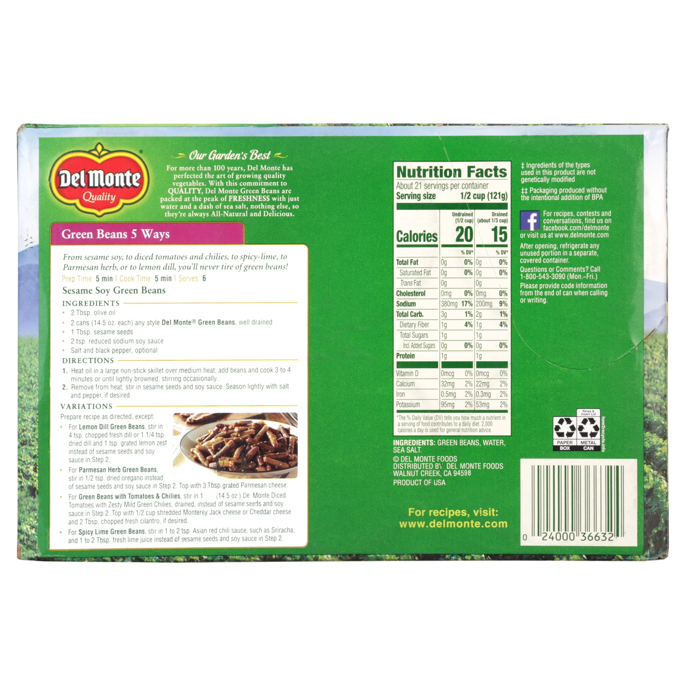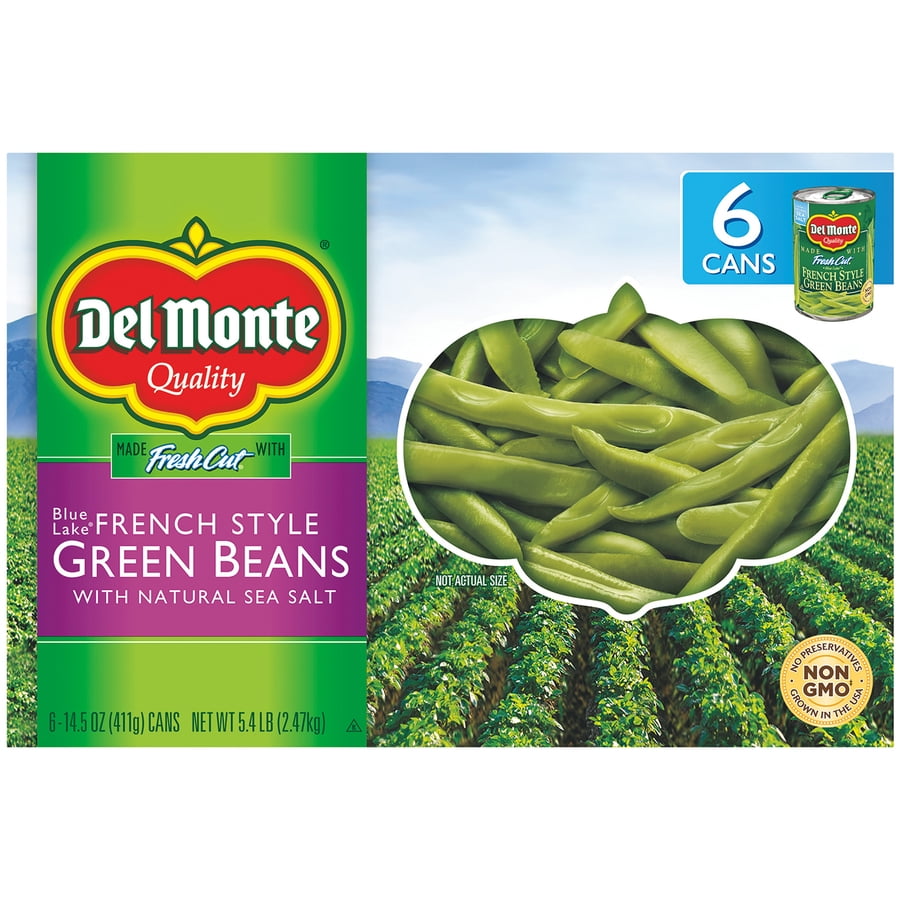 Del Monte Blue Lake French Style Green Beans are picked at the peak of ripeness, finely sliced, then packed fresh for unsurpassed flavor in every bite! These green beans contain just three simple ingredients: green beans, water and sea salt.