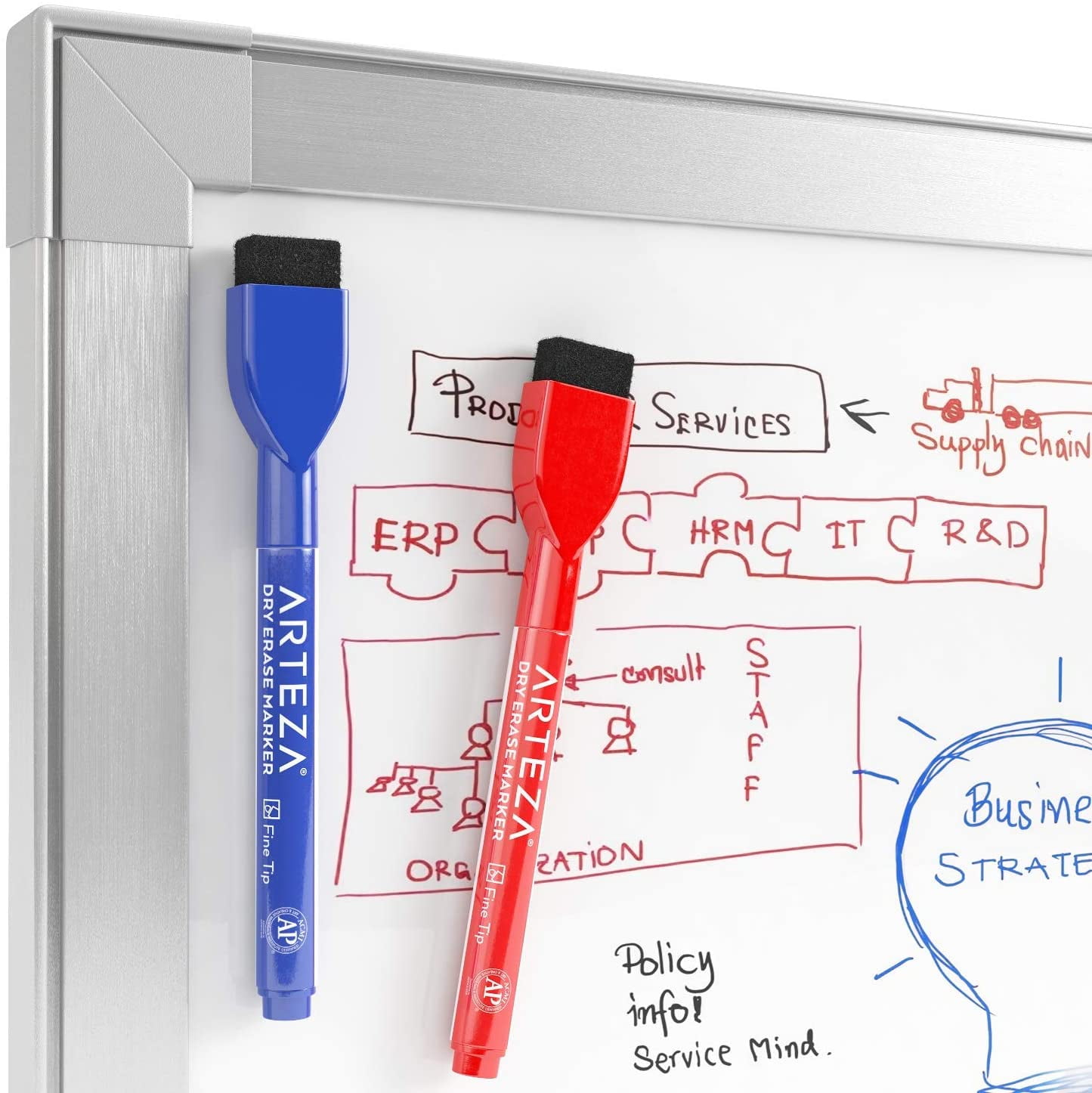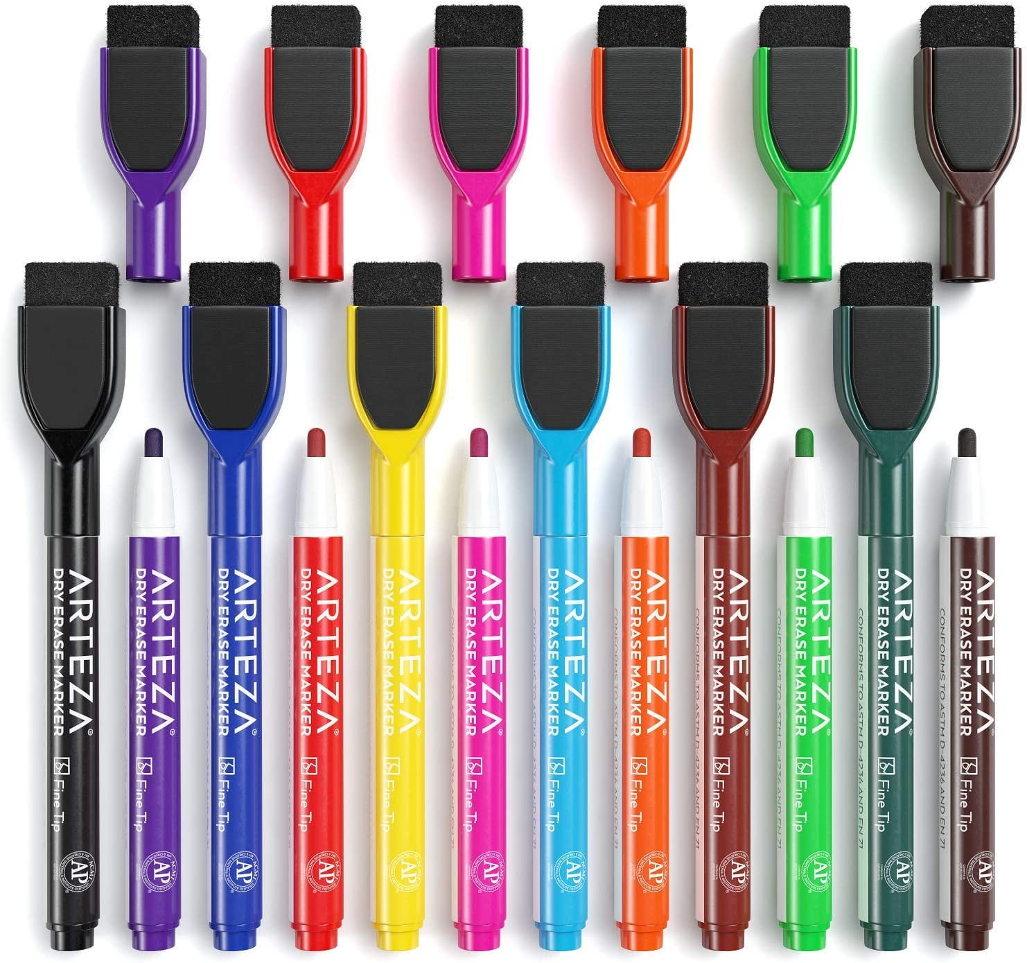 Arteza Dry Erase Markers, Magnetic Eraser Caps – 24 Pack (ARTZ-8416): 12 Bright Colors – This bulk pack of 24 includes 12 unique shades; easily differentiate information and add variety to your notes. Magnetic Eraser Caps – Revise or erase your writing by simply flipping over your marker; store it right on the board when not in use. Wipes Away Easily – Use a damp cloth or dry eraser to get a clean surface every time; won’t leave behind ghosting marks. AP Certified Non-Toxic – These fine tip dry erase markers contain low-odor ink that is AP Certified and safe for both adults and children. Get the best set of bold fine point dry erase markers for your office, classroom, or home. This bulk pack is perfect for class lectures, notes, calendars, and brainstorming sessions. With 12 unique colors to choose from, you’ll be able to add variety to your writing and differentiate information easily. The fine tip allows you to get optimal precision, plus you can adjust the nib to write slightly thicker lines. Besides whiteboard surfaces, these are also suitable for glass and metal.The rounded, lightweight barrel fits comfortably in your hand and writes smoothly onto non-porous surfaces. Once you’re ready to wipe off your writing, simply take a damp cloth or the dry eraser on the cap and wipe it over your surface. No need to search for your markers and erasers anymore, because you can keep them right on your board. You also don’t have to worry about your markers leaving ghosting marks behind; the ink removes cleanly every time. Arteza makes art supplies affordable to creators with every budget.