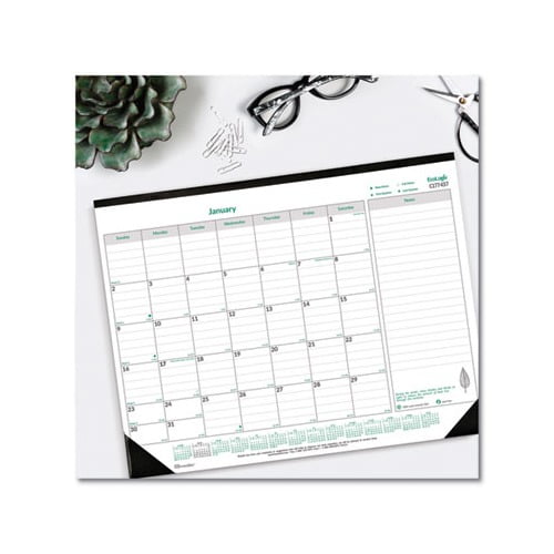 Designed with the future in mind with an eco-friendly tip each month. Ruled daily blocks, note space and a full-year reference calendar for future planning. Perforated sheets for easy removal. 100% post-consumer recycled paper. Size: 22 x 17 Page Color/Theme: EcoLogix: Green Edition Year: 2021 Calendar Term: 12-Month Jan-Dec. Green : Processed Chlorine Free PCF. PVC-free.