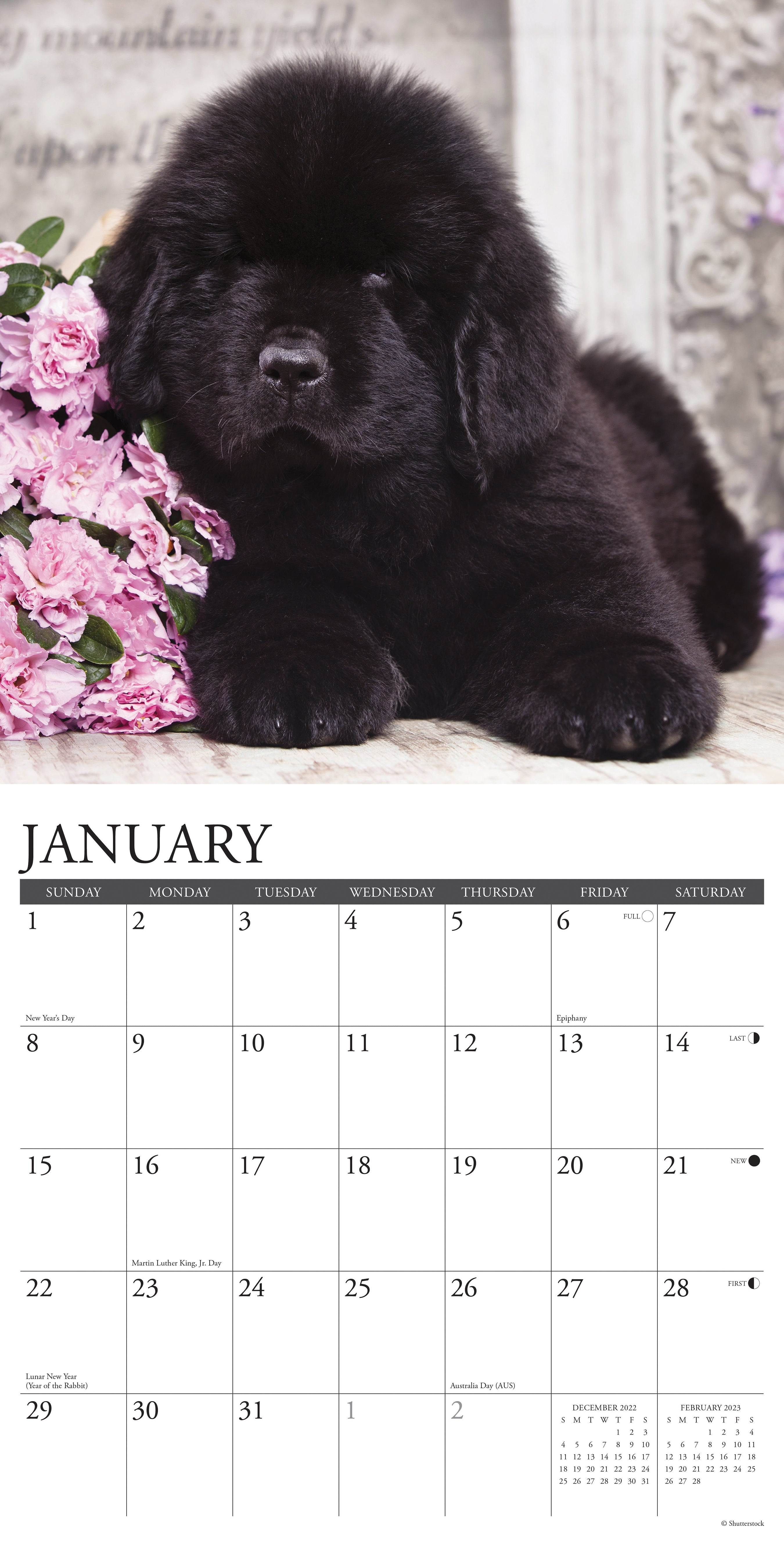 Newfoundlands are huge, imposing, bighearted creatures adored by their owners. Twelve delightful full color photographs typify their size, goodnature and easy going manner. Printed with soy-based inks on FSC certified paper, this 12" x 12" wall calendar features large monthly grids that offer ample room for jotting notes, along with six bonus months of July through December of 2022. Also includes moon phases (CST), standard U.S. and international holidays.