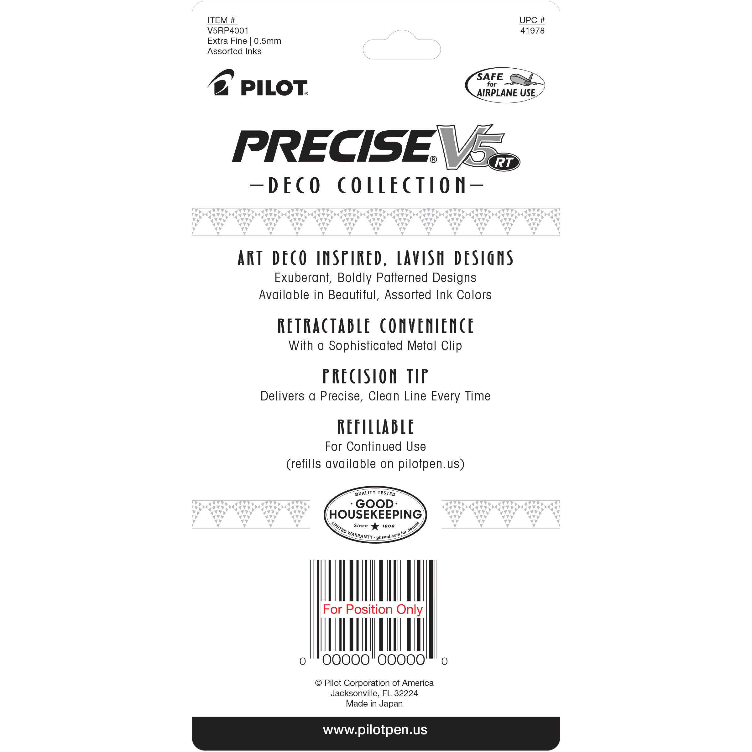 Always be on point with Pilot’s Precise premium Rolling Ball pen. Unparalleled performance for an ultra-smooth, handwriting enhancing, precision writing experience. Precise rolling ball retractable pens are designed to deliver the same kind of premium, precision writing experience as the capped version. Precise combines Pilot’s exceptionally smooth writing ink, premium metal accents, and comfortable grip for a go anywhere sophisticated writing experience. Point size: 0.5mm Extra Fine. Assorted Ink Colors. 4 Count.
