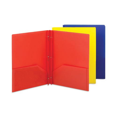 Durable two-pocket folders are perfect for all types of presentations, proposals and projects. They allow for easy storage and transport while keeping the documents organized and easily accessible. The large pockets holds up to 50 sheets each. Metal fasteners hold up to 80 three-hole punched papers. Inside back pocket is die cut to hold a business card. Durable poly matrl is tear- and water-resistant and easy-to-clean. Acid free and PVC free.