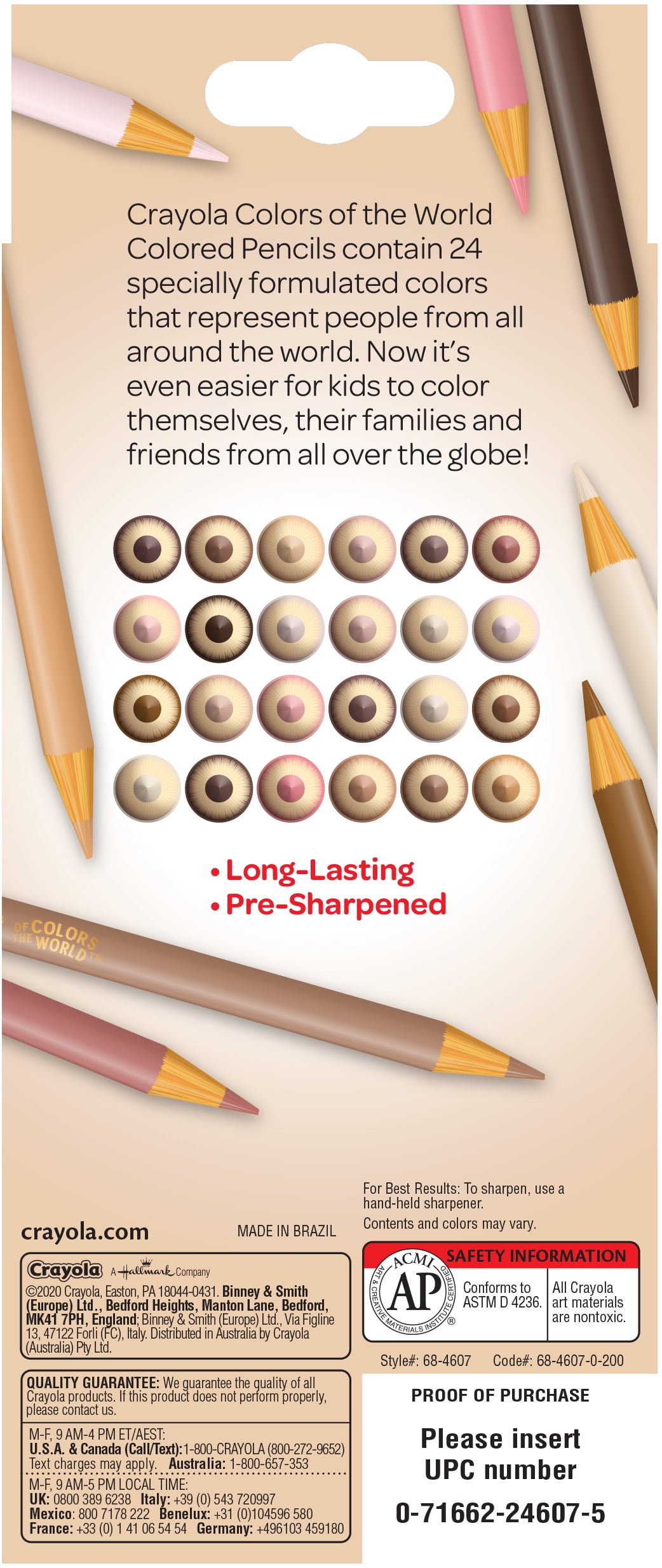 - NEW 24 COLORED PENCILS: This 24 piece colored pencil set features 24 new Crayola colors that represent people from around the world.