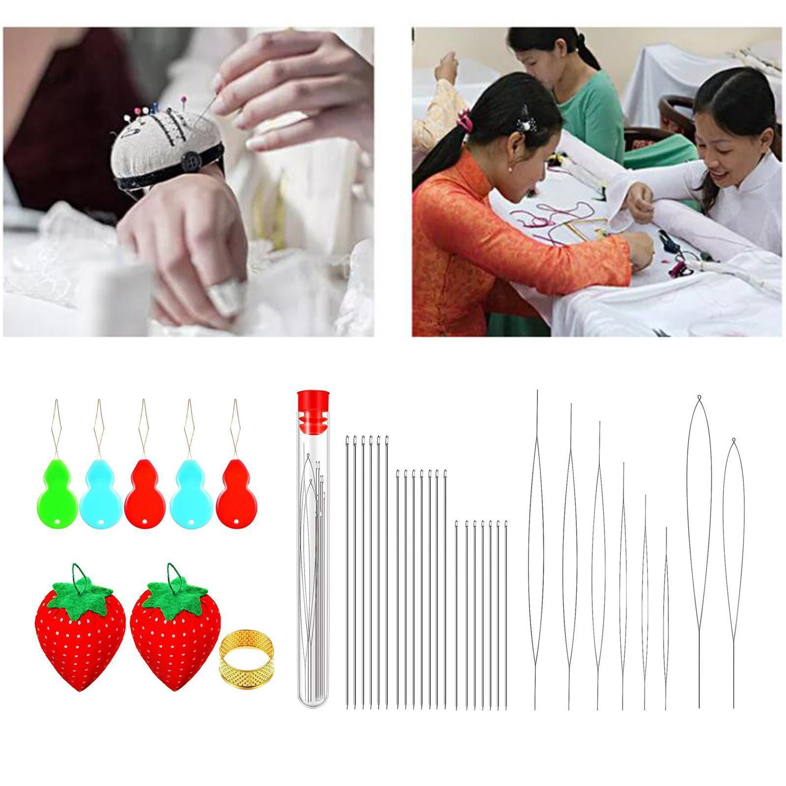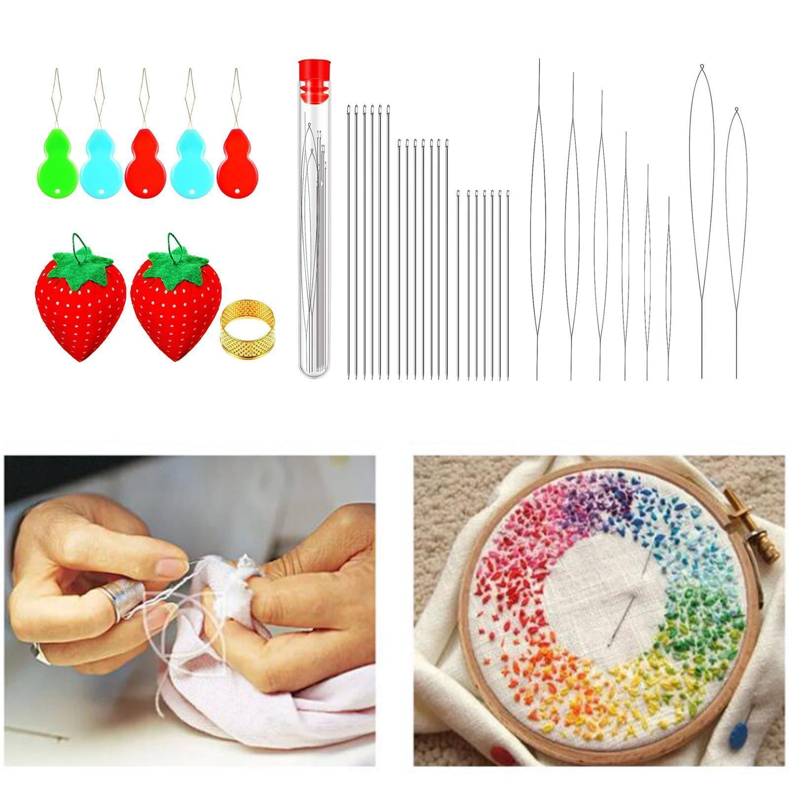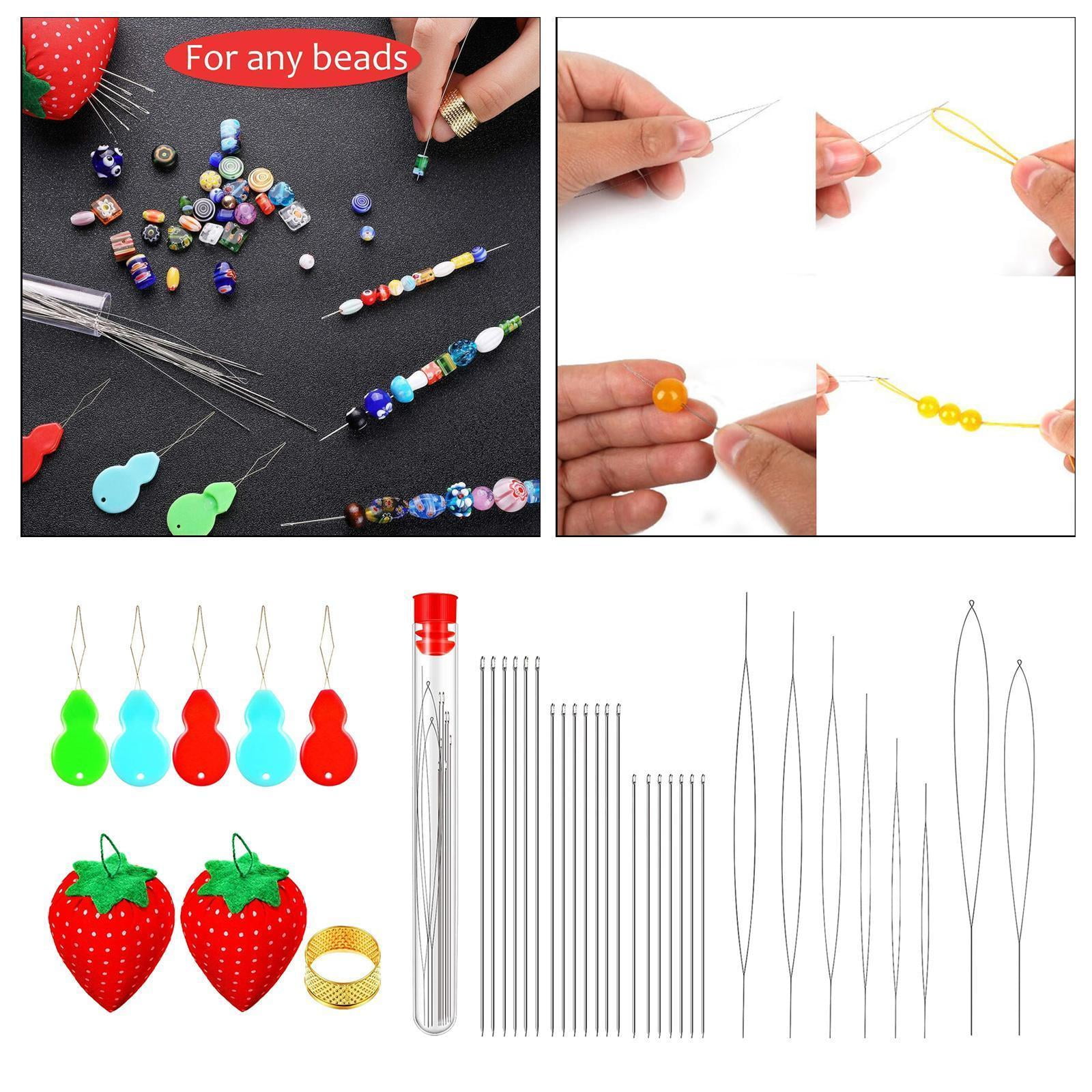 Package – 20 Pieces long straight bead thread needles, 6 Pieces big eye beading needles, 2 Pieces Eye twist beading needles, 5 Pieces Gourd-shaped beading Needle Threaders(Assorted colors), 1 Piece thimble and 2 pieces strawberry shape Sewing Needles Holder Pin Cushion