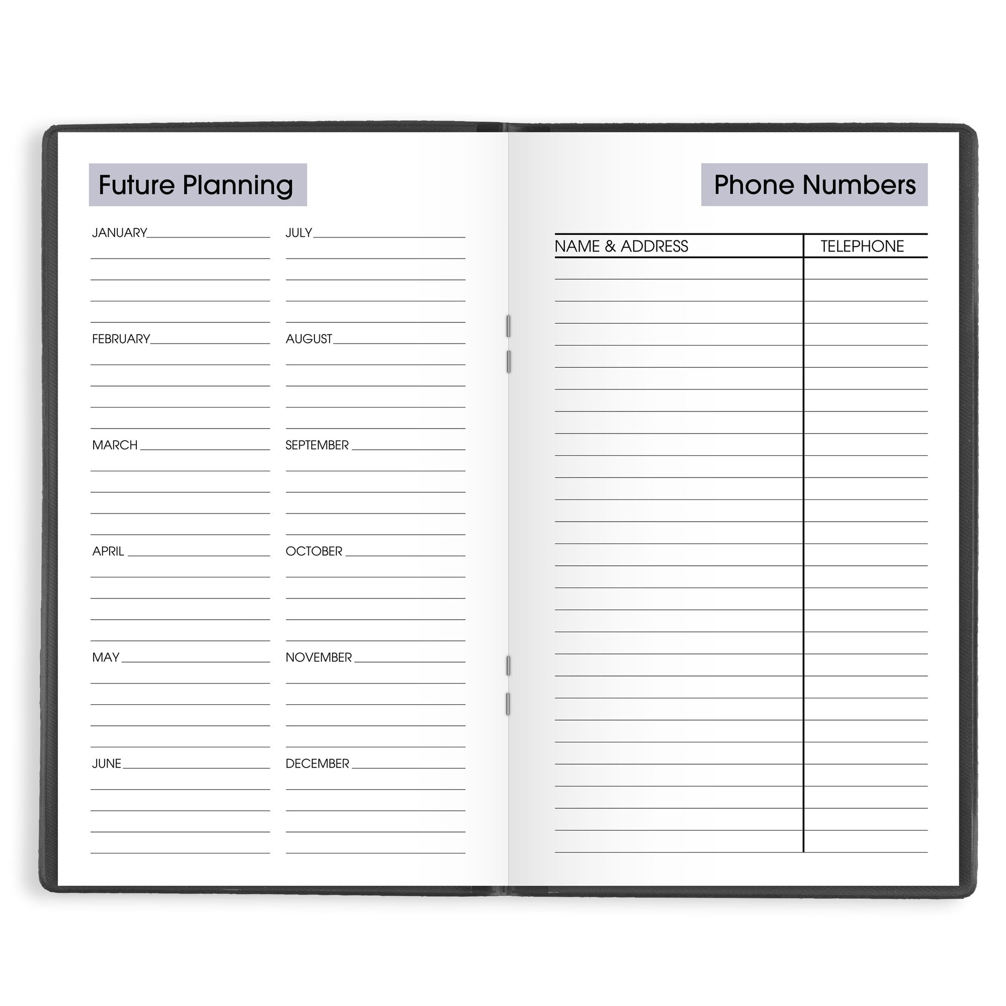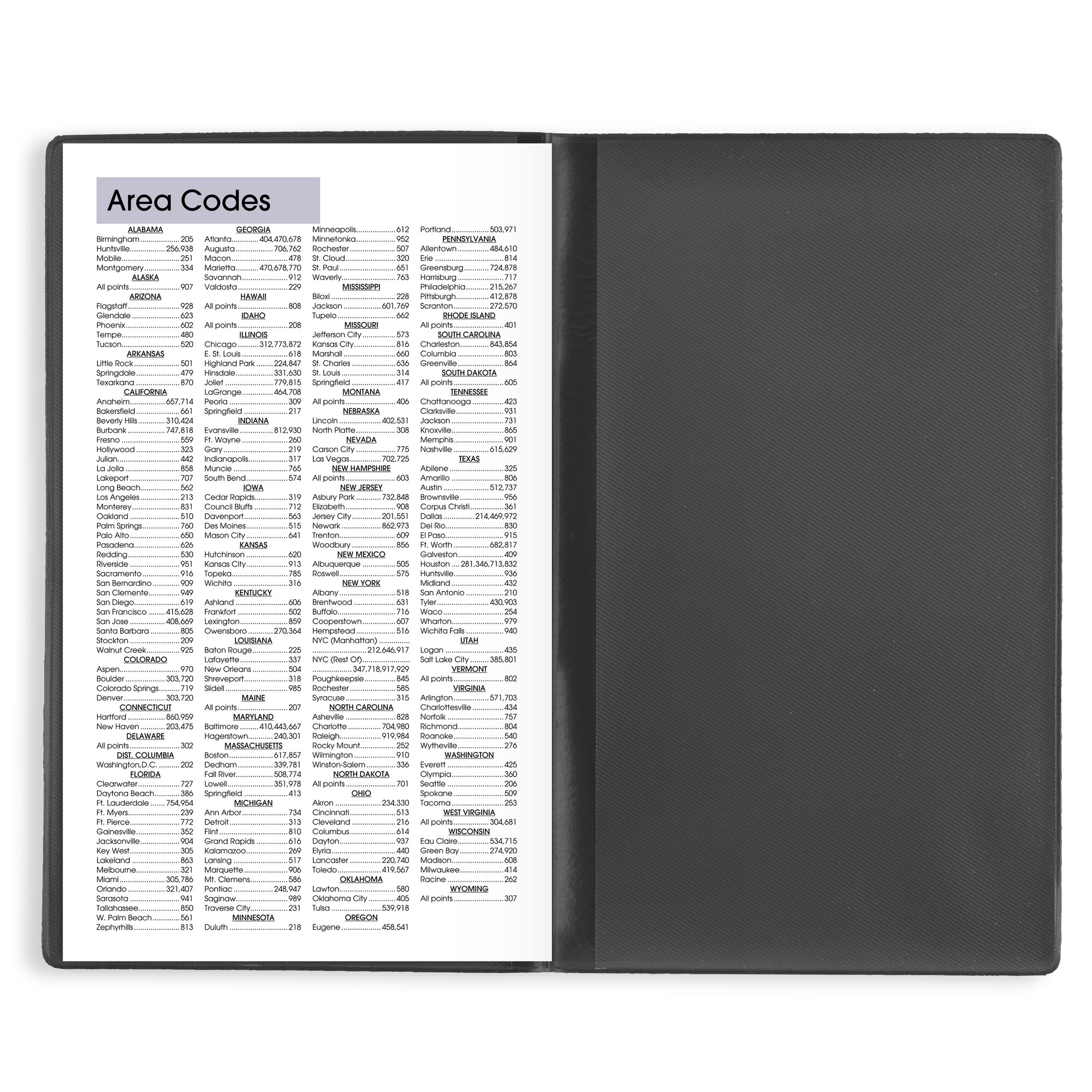 - Special pages include a three year reference calendar, contacts, metric conversion reference, time zone and area codes map