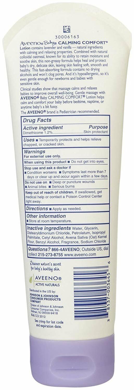Aveeno baby calming comfort lotion-8 oz protect and heal your baby’s delicate skin with the ingredients in aveeno baby calming comfort lotion. This lotion helps retain moisture while soothing .why you’ll love it: this lotion can be used to moisturize your baby’s skin for a full 24 hours. Features: contains ingredients such as lavender and vanilla gentle for infants with sensitive skinnon-greasy and fast-absorbing formula contains colloidal oatmeal.