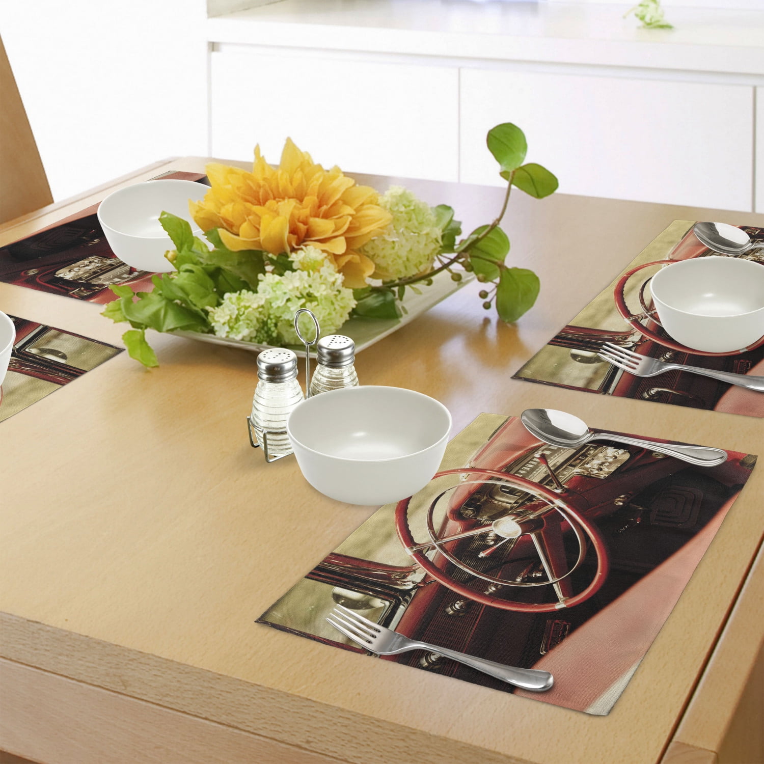 Placemats set of 4. Measurement of each table mat: 12.5 Inches long and 18.5 Inches wide. Made from: %100 high quality polyester canvas duck fabric with hand-sewn finished edges. Great for any occasion and daily use. Machine washable. Wrinkle Resistant. No ironing needed. Dress up and decorate your table with style! These unique place mats are the perfect accent accesory for your table setting. With tens of 1000’s of fresh and fun designs you can find the perfect placemats for any occasion, event or just casual dinners. Great for dinner parties, housewarming, birthday celebrations, entertaining and family gatherings. They can be used indoor and outdoor. Use them in your home, garden, office, cafe, party house, restaurant, bar, hotel. We use the highest grade ink and state of the art equipment to ensure vibrant colors and lasting durability. Fade-resistant. Environmentally friendly, no dye substance harming health of your family. Colors won’t fade thanks to new digital printing methods. They are durable and will last long with tailored hems. It is a perfect gift idea for your wife, husband, best friend, mom, dad, sister, brother, grandma, colleague and all other beloved ones with many of surprising designs. Customized, personalized products are very popular. As manufacturers of digital printed design products, we follow current trends and bring you the latest hot fashion products. Either a gift to your family or friend, relative or boyfriend girlfriend, or to yourself, the item should be interesting and authentic. CARE INSTUCTIONS: Machine washable; with mild detergent and water; Do not bleach. Dries fast. Due to manual measurement, please kindly allow 1-2 cm discrepancy. The digital images we display have the most accurate color possible, however due to differences in computer monitors, we cannot be responsible for variations in color between the actual product and your screen. Proudly designed & printed in the USA.Cars Placemats Set of 4 Interior of an Antique Classic Aged Car Exquisite Control Board Details Retro Picture, Washable Fabric Place Mats for Dining Room Kitchen Table Decor,Red Silver, by Ambesonne