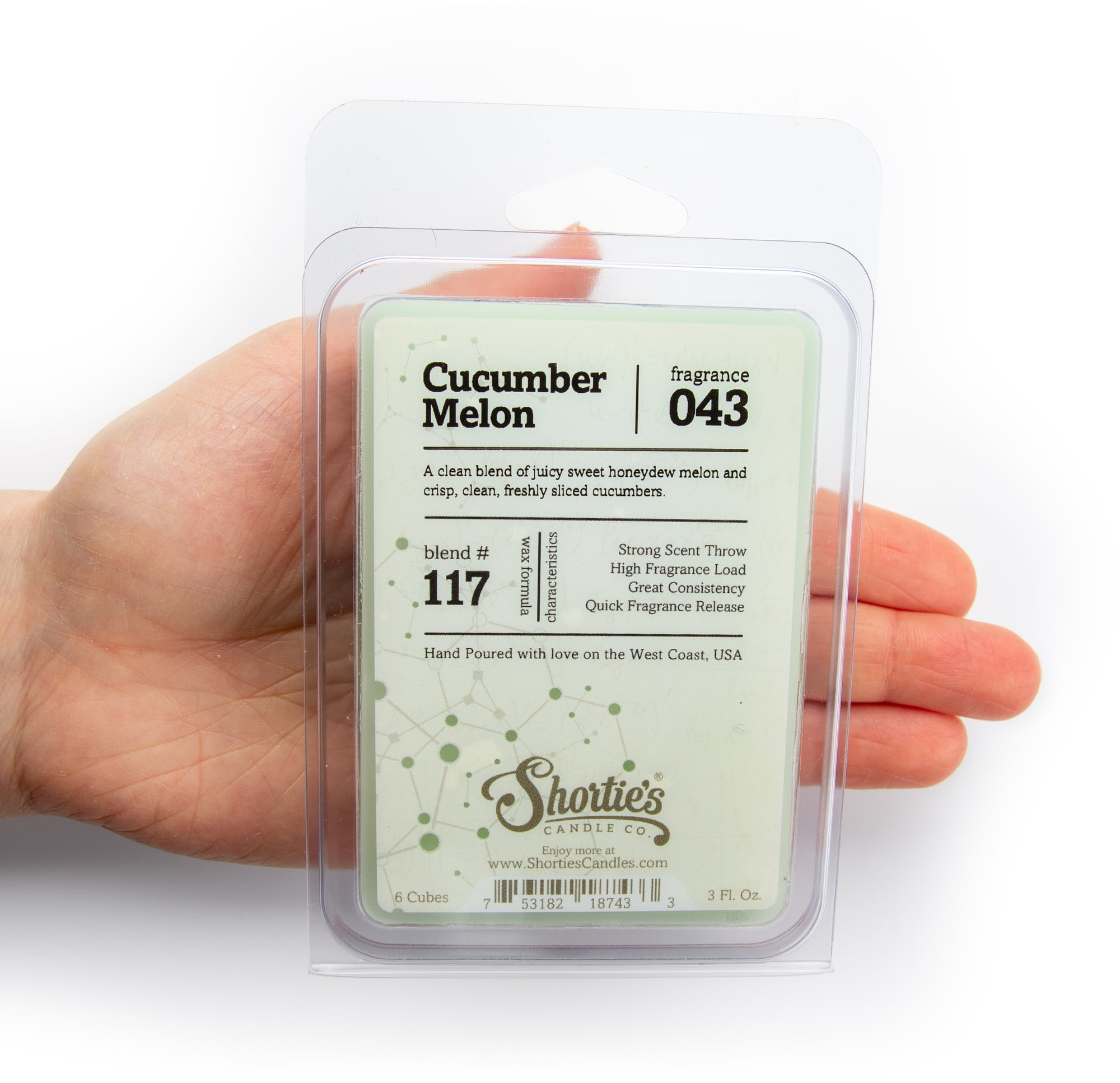 Dive into this clean blend of juicy sweet honeydew melon and crisp, clean, freshly sliced cucumbers. This popular fragrance has been reborn stronger than ever! Our Premium Cucumber Melon Wax Melts are highly scented, made with Essential and Natural fragrance oils, and are completely phthalate free, vegan, and non toxic! Each pack of Wax Melts contain 6 1/2 Oz. warmer wax cubes, and each will provide strong fragrance for 8+ hours. Our Premium Wax Melts are a completely safe flameless fragrance wickless candle option for any space and pets of all types. Our Formula 117 wax blend is made with a soft paraffin, and is designed for maximum scent throw. This new formula also comes out of the package much easier than our classic formula. Truly an experiment, but one we really like!