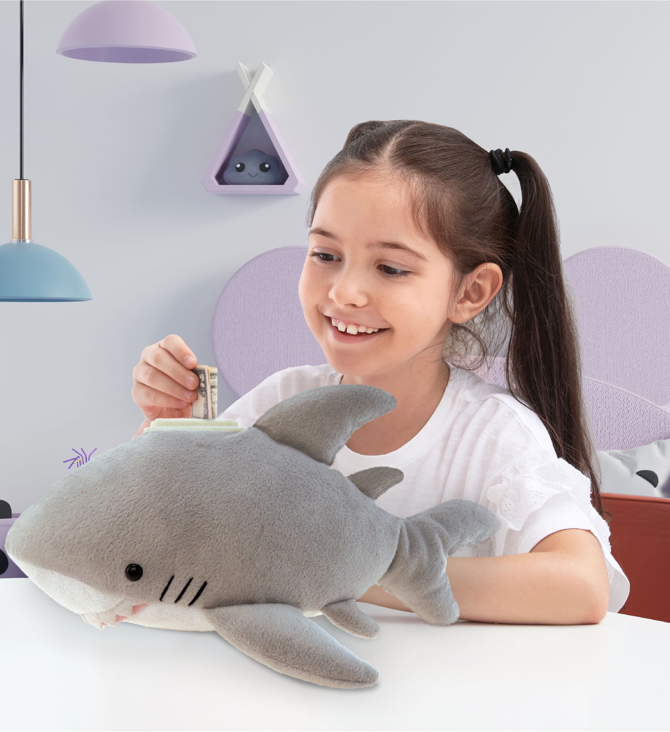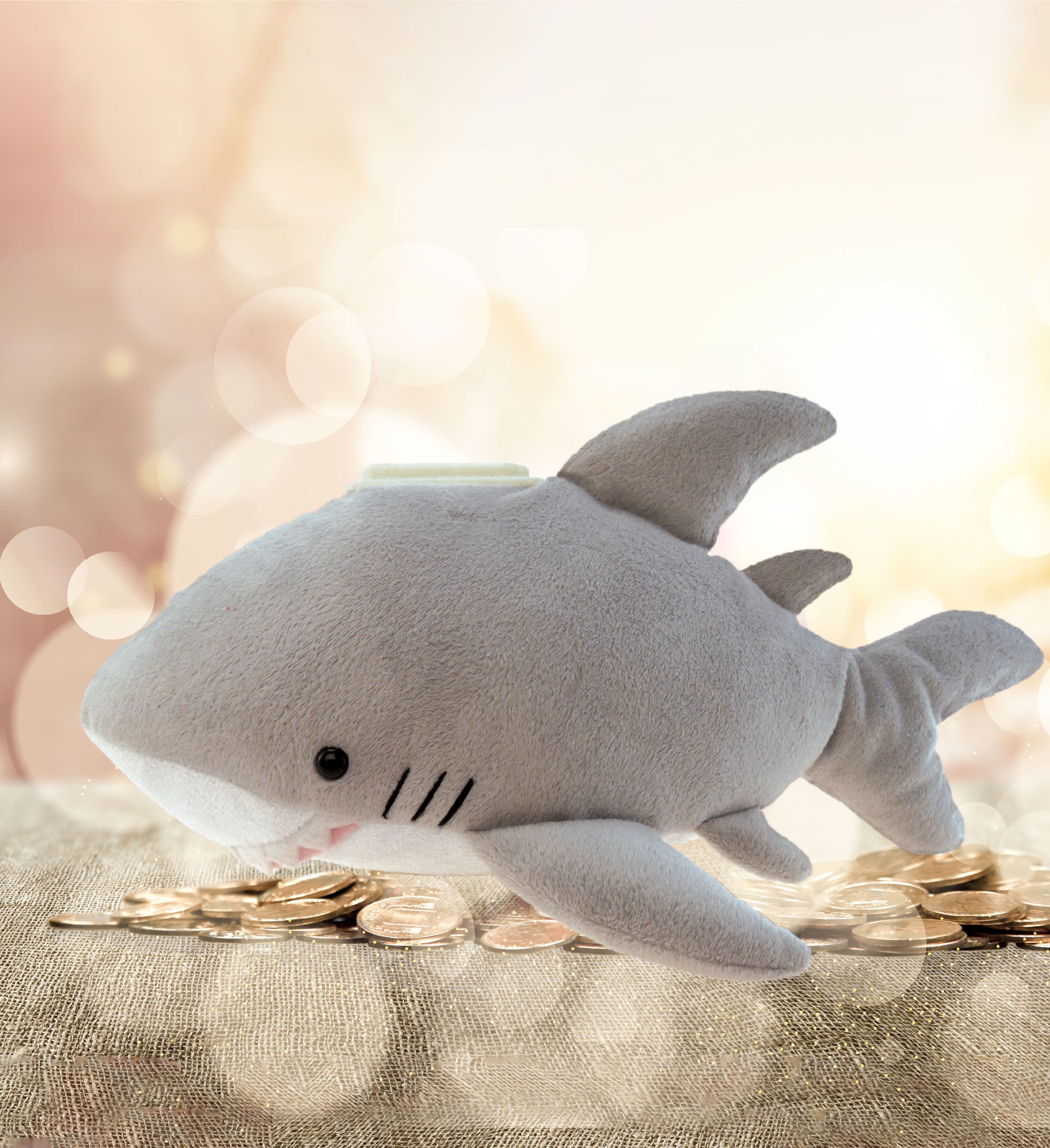 - Plush animal coin bank for fun imaginary play, while saving money. A perfect entertainment & educational toy for kids to learn how to save money and the benefit of having savings. Add the cute gray shark plush huggie bank as room decor which kids can use to store their change and extra from their allowance. Gift to little kids who love to play with realistic ocean life plush toys.