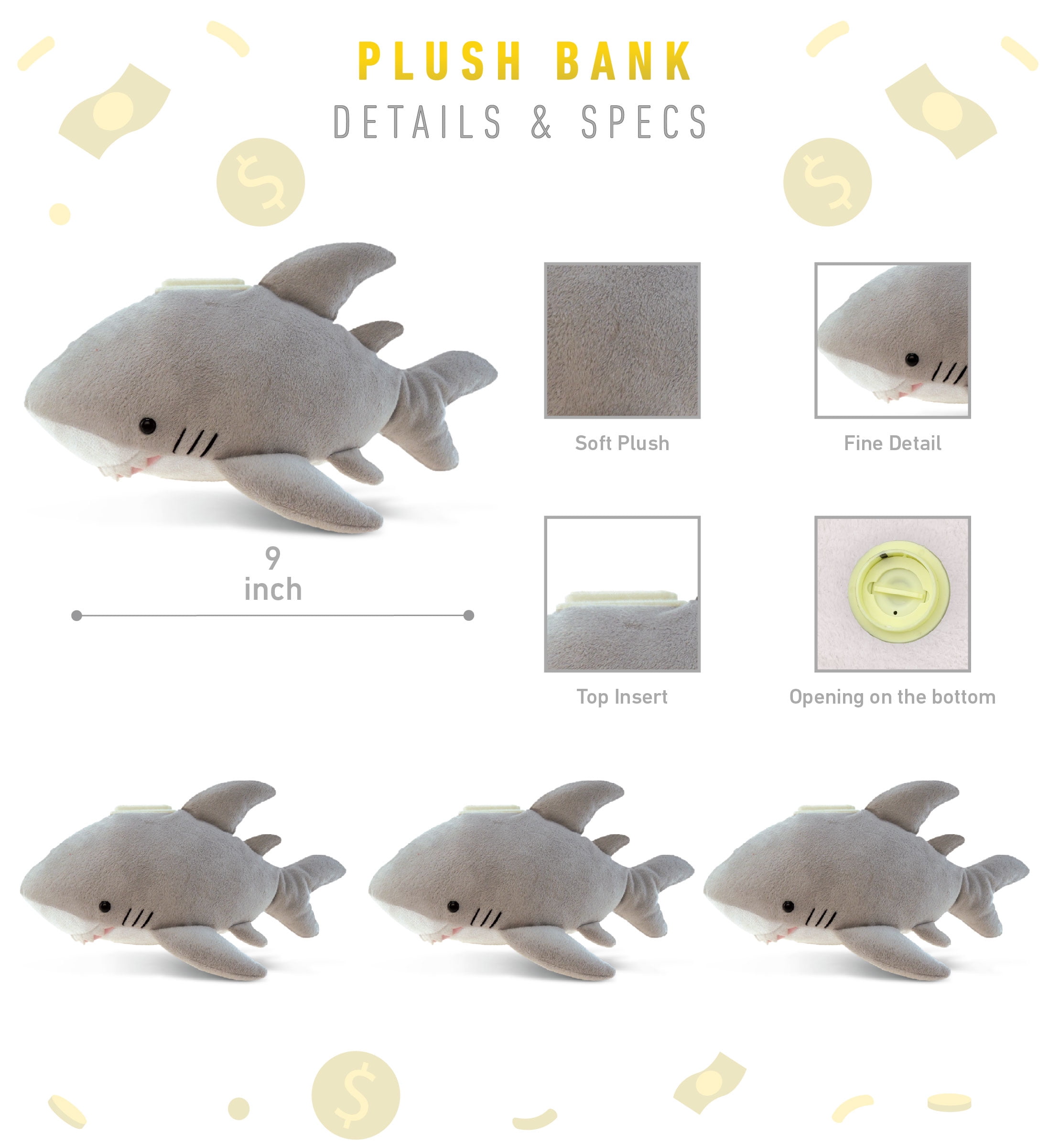 - The adorable gray shark coin bank is made from 100% premium new polyester, stuffed with polyester fillings. Hand sewn with soft gray fabric that adds softness to the toy. The plush money bank that has a hole on its back where you can insert the money & a large compartment inside to store your kid’s coins & cash. A strong & sturdy animal plush toy crafted with durable materials to obtain a longer lifespan.
