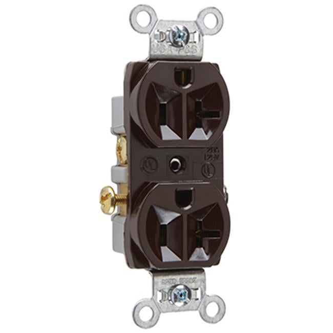 20a, 125v, brown, 2 pole, 3 wire grounding, heavy duty duplex outlet, nema 5-20r, ul, csa, superior blade retention prevents plugs from falling out, side wire termination accepts #14 through #12 awg stranded & solid copper wire, unbreakable face & back body prevents devices breakage, commercial/specification grade.