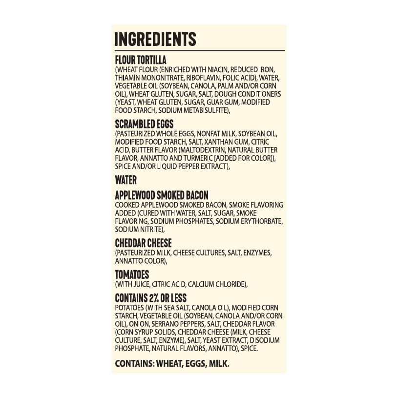 - Made with real scrambled eggs, Applewood smoked bacon, cheddar cheese and tomatoes wrapped in an fresh-baked flour tortilla