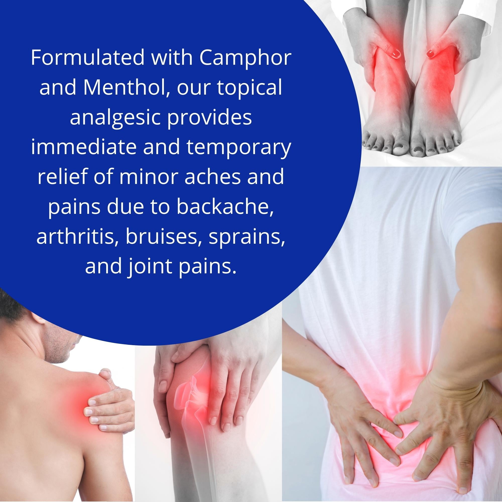 - Active ingredients: Camphor 11% (topical analgesic) and Menthol 11% (topical analgesic)