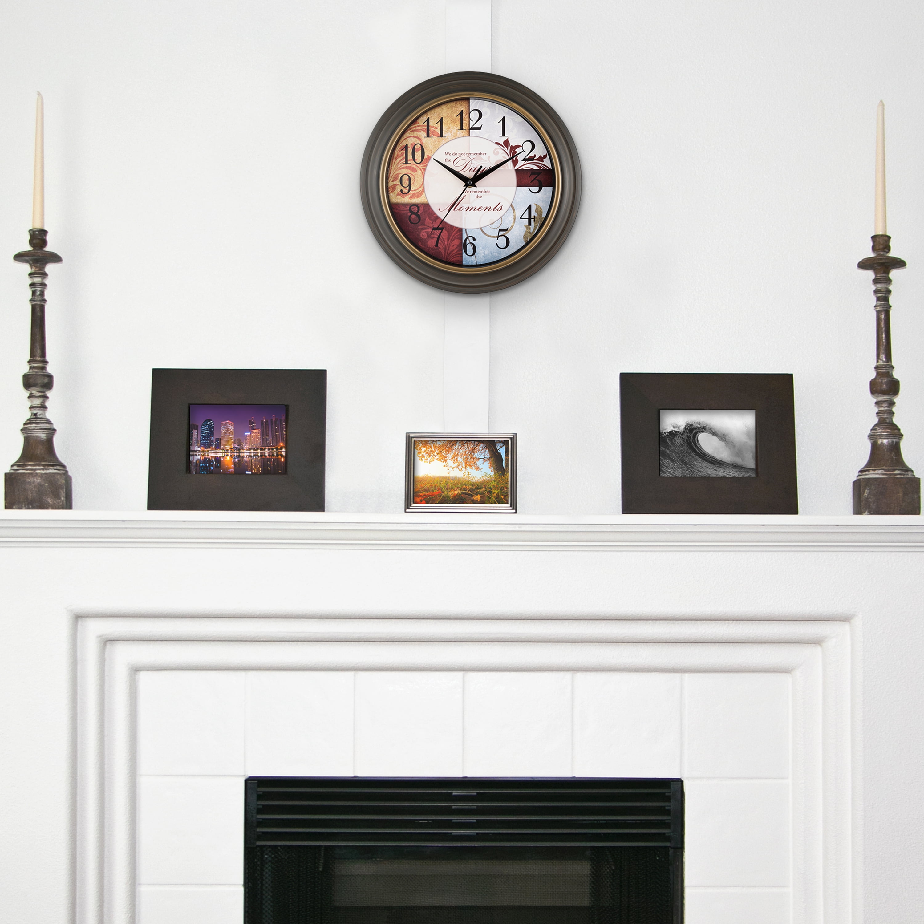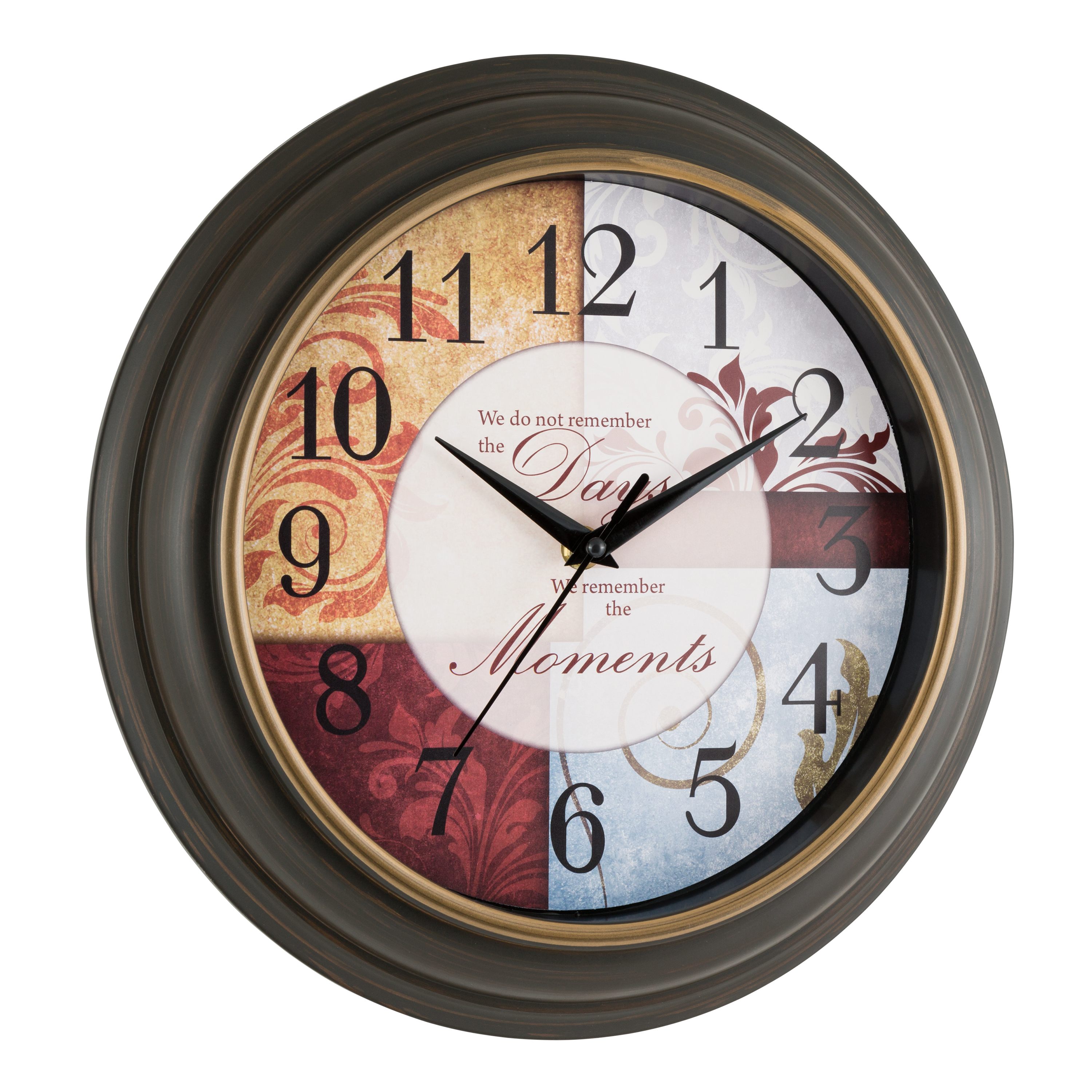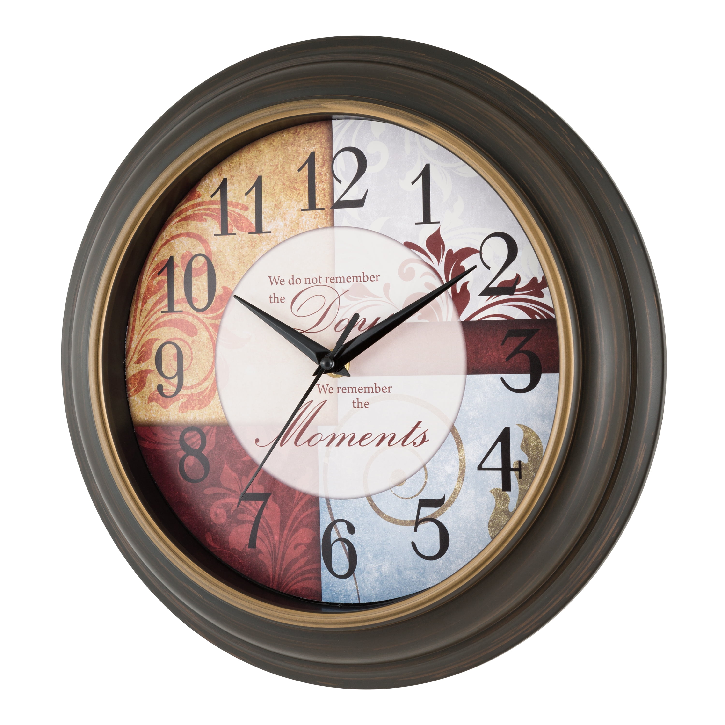 A daily reminder when you check the time that "We do not remember the Days, that we will remember the Moments." Gold bezel overlay in a smooth, brown finished frame catches your eye to reflect each day. With a quiet sweeping hand, this 11.25 inch clock can be placed in a bedroom or study. Requires (not included) 1 AA alkaline battery for operation.
