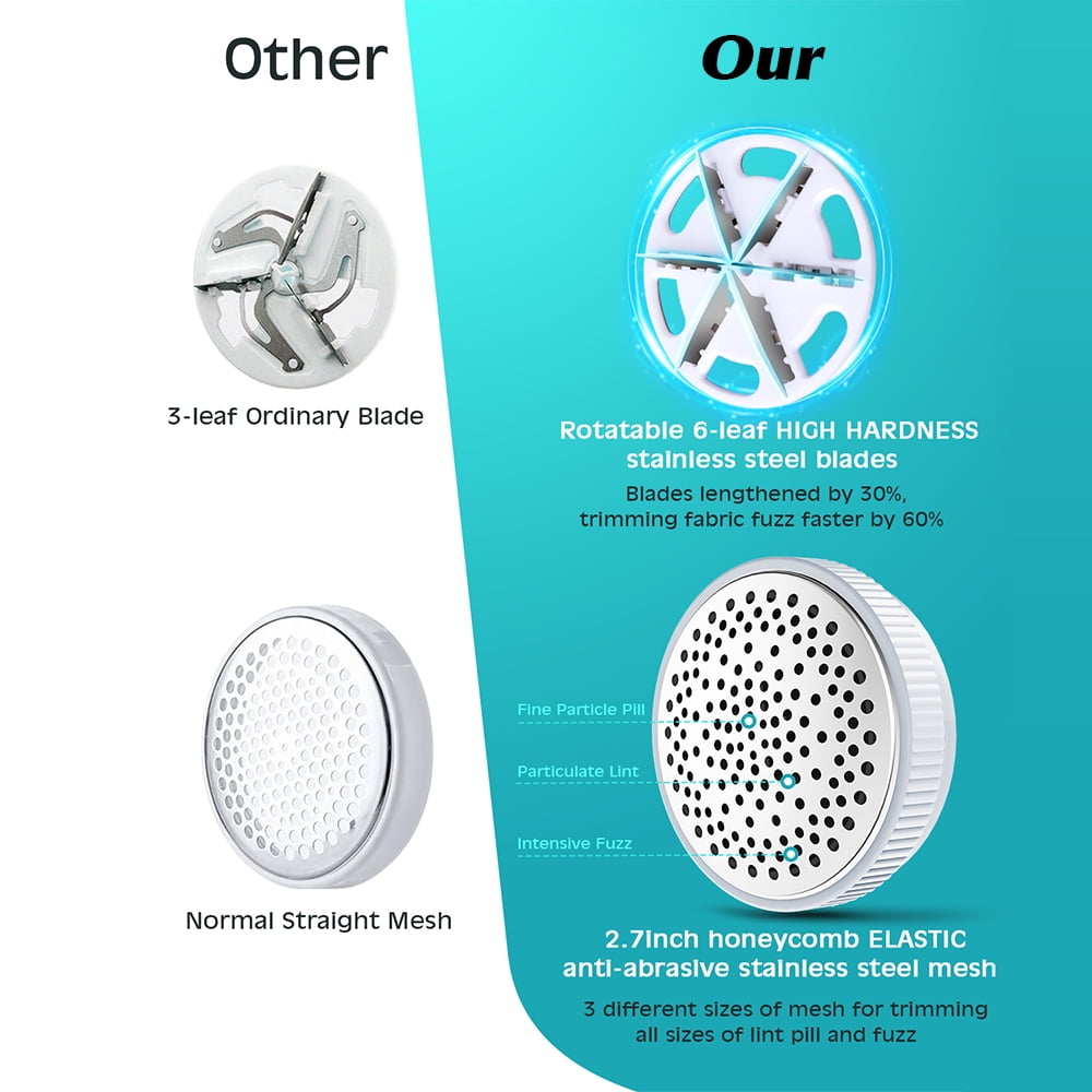 - 【HIGH HARDNESS BLADES & ELASTIC MESH】Rotatable lengthened 30% 6-leaf 420J2 HIGH HARDNESS stainless steel blades float up and down automatically so as to avoid breaking and jamming, trimming fabric fuzz faster by 60% without damaging clothes. 2.7inch bionic honeycomb anti-abrasive stainless steel mesh increases coverage by 50%, adapts to the uneven surface automatically, capturing all size of lint precisely in a large area.