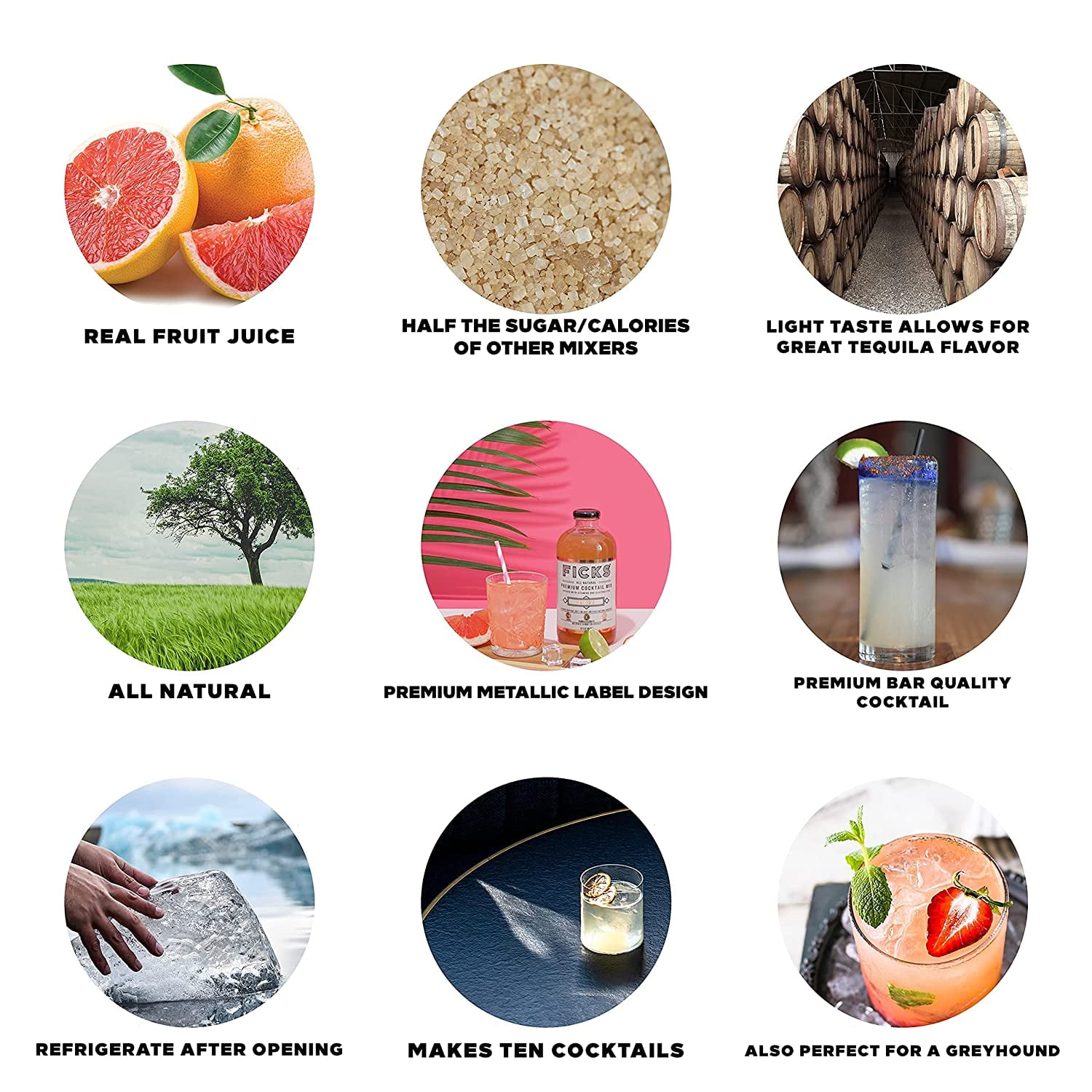 FICKS Paloma Cocktail Mix lets you mix a delicious grapefruit margarita with real red grapefruit juice as a low sugar cocktail. With all natural ingredients, FICKS Paloma Cocktail Mix helps you mix a craft, low sugar Paloma cocktail in seconds. This blend of California grapefruits and Mexican limes makes this tequila cocktail bittersweet in the most refreshing way. Shake with your favorite tequila for a classic grapefruit margarita, or with vodka for our equally delicious take on a Greyhound cocktail. Each bottle of FICKS Paloma Cocktail Mix makes about 10 cocktails.