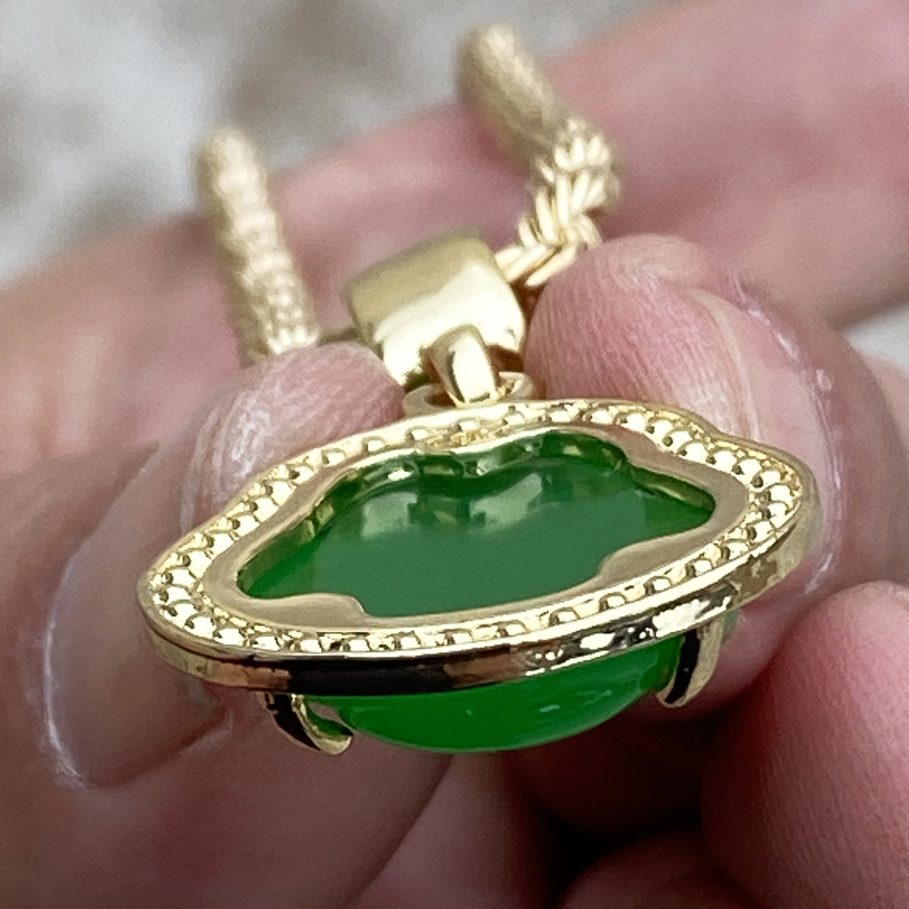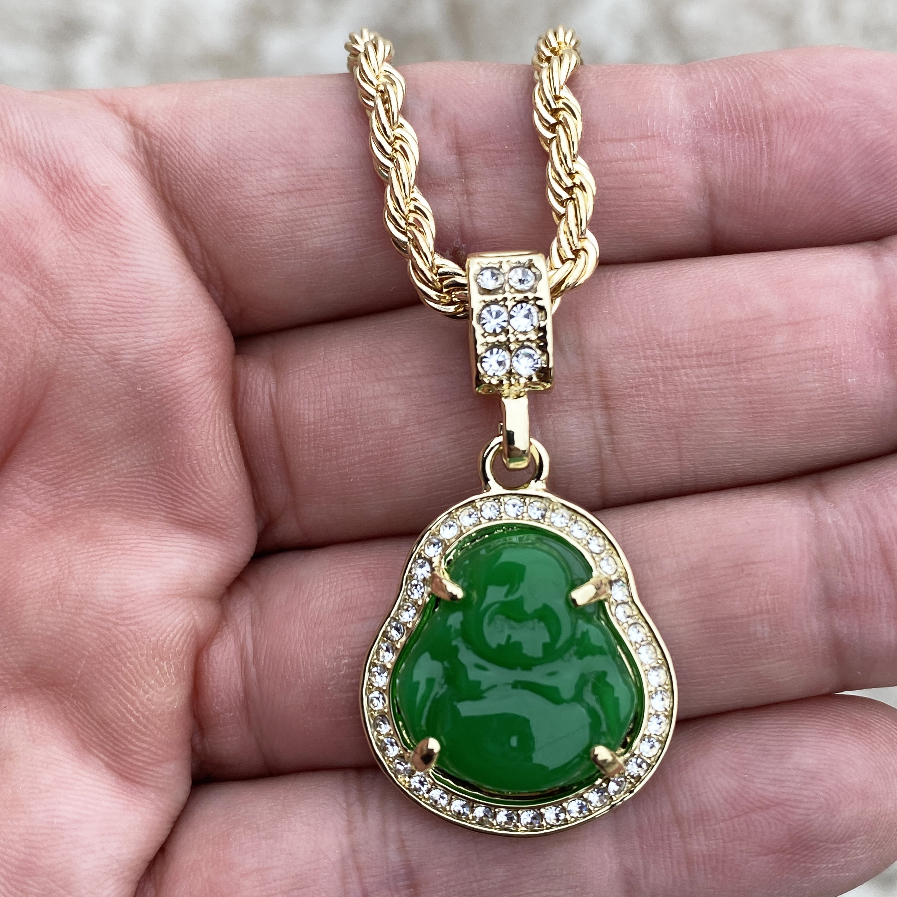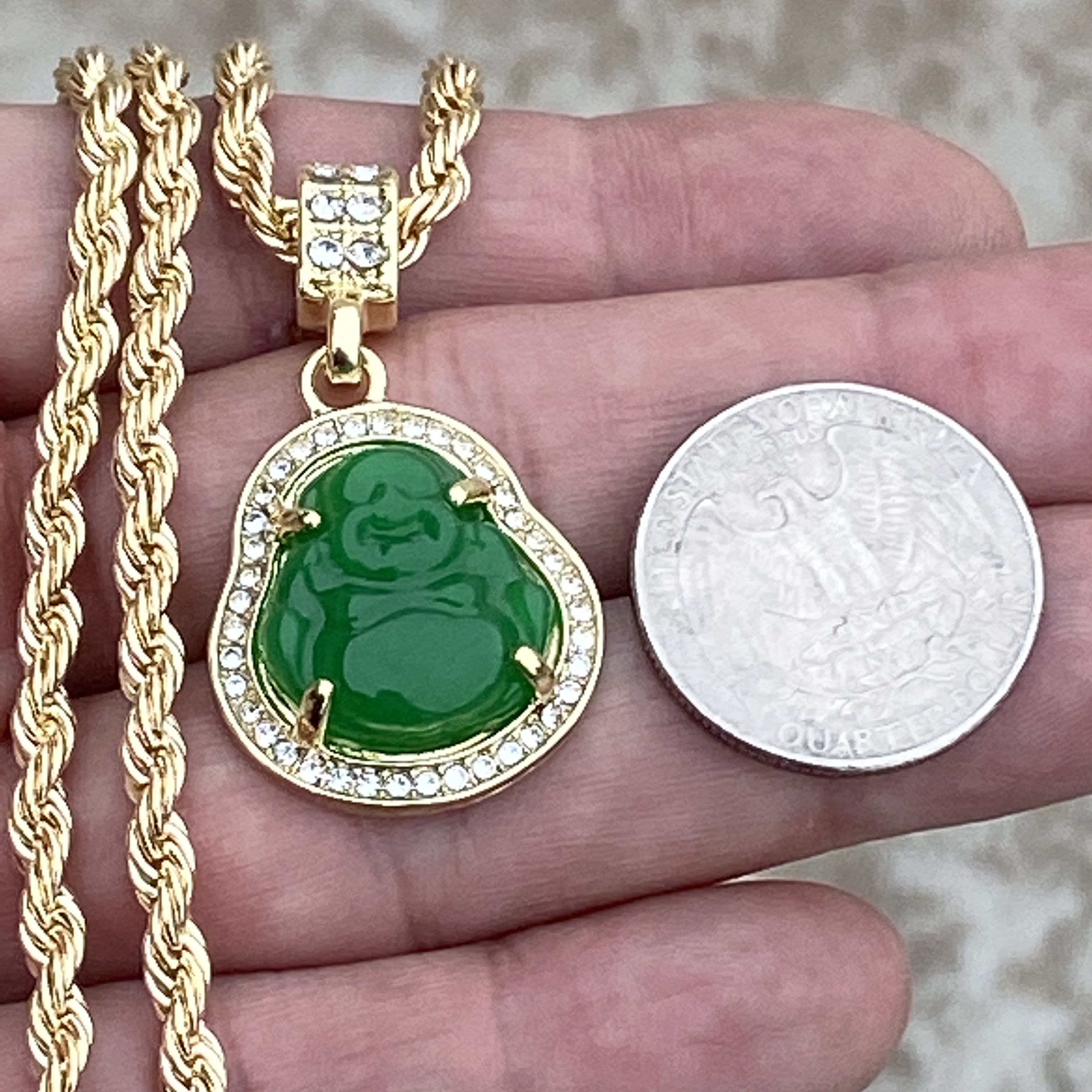 Green Buddha iced pendant necklace. Gold plated 24" inch x 4MM thick rope chain. Rope chain has a stylish & secure lobster claw lock. Pendant is iced with vivid round-cut stones. Nice weight to this piece at approx 30 grams. Pendant is 1.25" in tall (w/o bale) x .75" wide. Bale hook shines bright with 6 round stones. High detailed bright green resin Buddha pendant. Beautiful buddha chain necklace for both men and women.