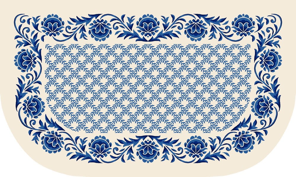Effortlessly create classic style with the timeless blue and white French country inspired design of the Mainstays Nature Trend Slice Starch Blue Flower Kitchen Mat, size 18”x30”. Printed on a canvas of sustainably sourced 100% recycled polyester yarn, this dependable kitchen rug offers inherent moisture, fade and stain resistance, making it ideal for places prone to spills like under the kitchen sink, stove top or near other food prep areas. Backed with the skid-resistant security of latex, this mat is designed to stay safely in place. Easy to clean, simply spot clean as needed a with a solution of water and mild detergent.