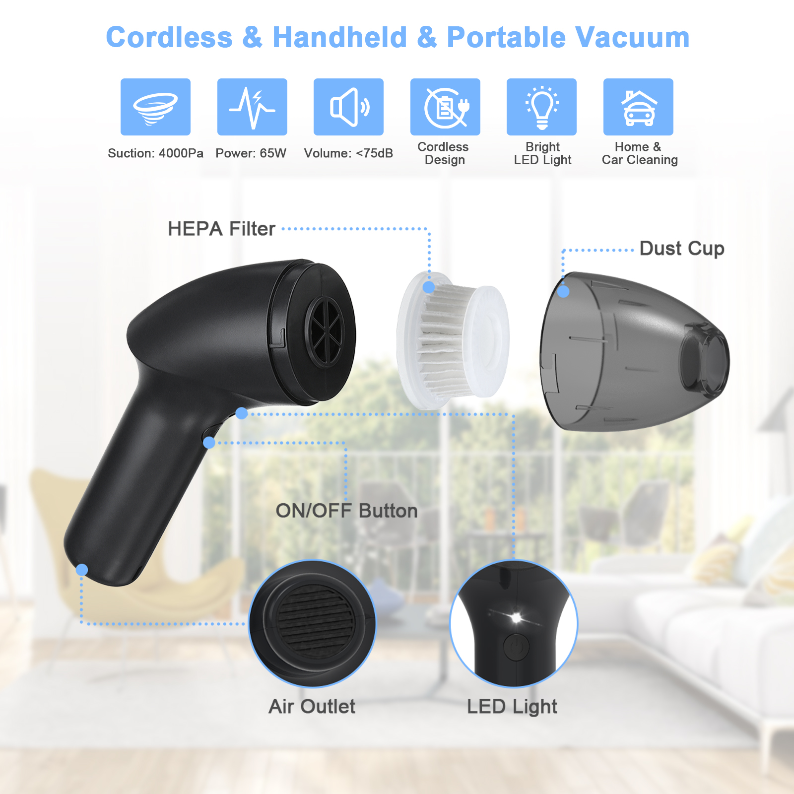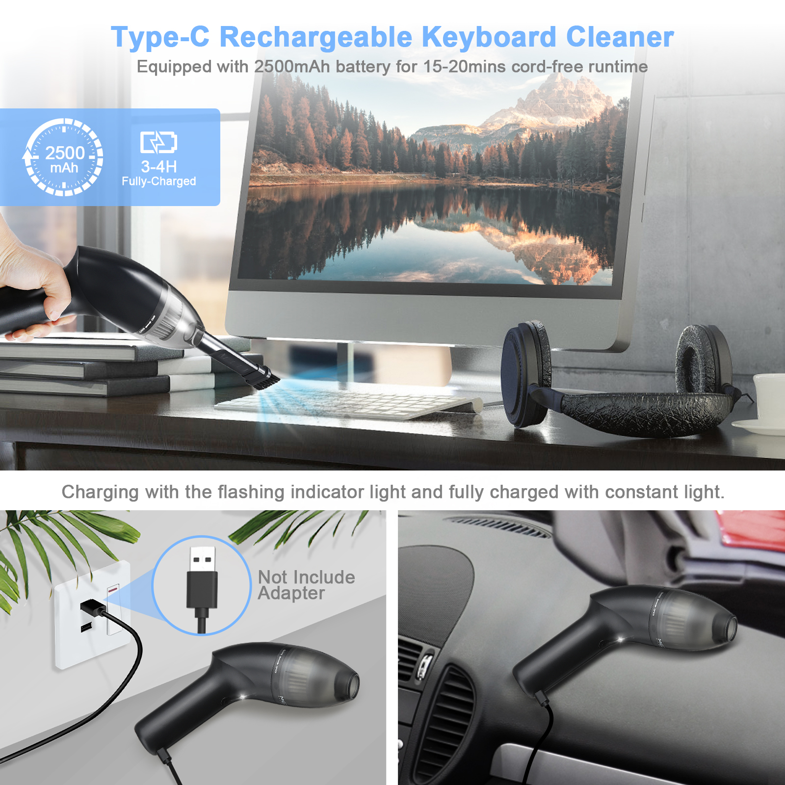 Meco Hand Vacuum Cordless Handheld Vacuum Cleaner for Car Computer Keyboard with PTFE Filter & LED Light, 4.3kPa Strong Suction. Meco hand vacuum cleaner has a 4.3kPa powerful suction to easily remove dust from cars, computer keyboards, and homes. The cordless computer keyboard vacuum cleaner has a 2500mAh lithium battery, which can run constantly for about 20mins with a quick charge of 3-4 hours. This mini light handheld vacuum cleaner is ergonomic, allowing you to use it for a long time without feeling tired. Besides, this vacuum cleaner for cars has an LED light for cleaning in the dark corners. Its filter material is PTFE, durable in terms of life, and more effective to filter 99.6% of dust as well as prevent secondary pollution. In order to prolong the service life, it is recommended to use a dust blower or brush to clean the filter instead of washing it. This hand vacuum cordless also has low noise (ï¼ 75dB) to avoid disturbing others. Meco cordless handheld vacuum cleaner is ideal to vacuum up dust from cars, computer keyboards, and homes.