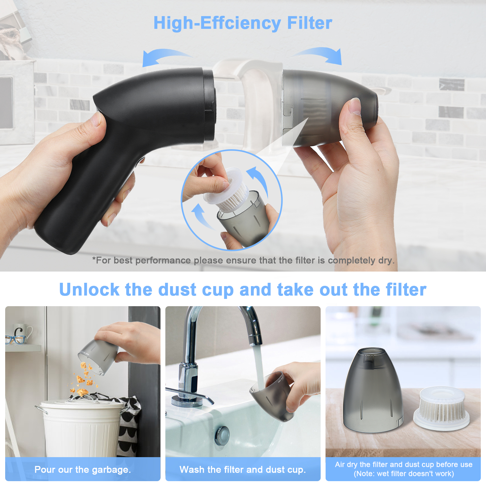 - How to clean the hand vacuum cleaner: Unscrew the dust bin. Remove the filter. Clean the dust bin, use a brush or dust blower to clean the filter. Dry the dust bin and reinstall it.