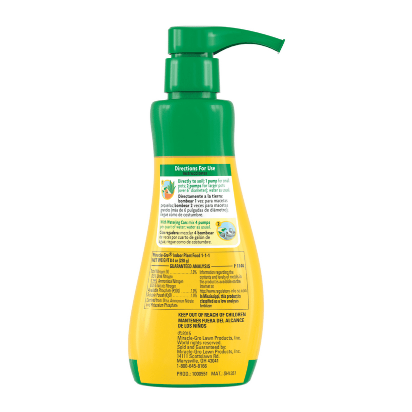 Give your houseplants instant nutrition with Miracle-Gro® Indoor Plant Food. This is an easy-to-use plant food that has been specifically designed to provide houseplants with instant nutrition. This plant food is safe to use on all indoor plants, including edibles (when used as directed). Simply apply the formula directly to the soil, or mix it with water in a watering can. If applying directly to the soil use 1 pump for small pots or 2 pumps for larger pots that are over 6". After feeding, water your plants as usual. If you are adding this plant food to a watering can, simply mix 4 pumps per every quart of water and then water as recommended for your plant. For the best results, feed your indoor plants Miracle-Gro® Indoor Plant Food once a week. Instantly feed all of your indoor houseplants, including edibles, and enjoy the results, with Miracle-Gro® Indoor Plant Food.