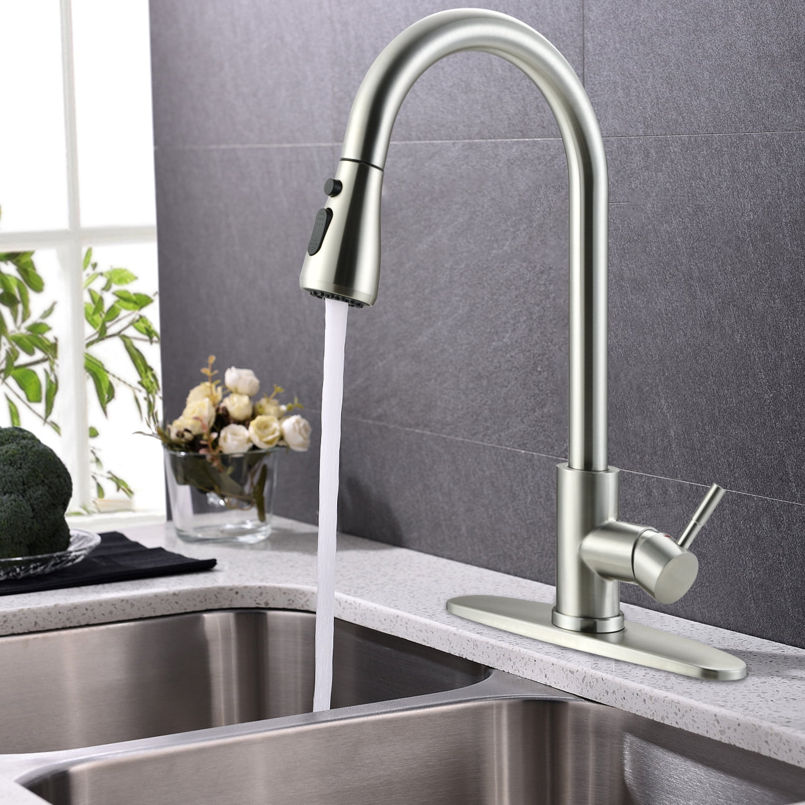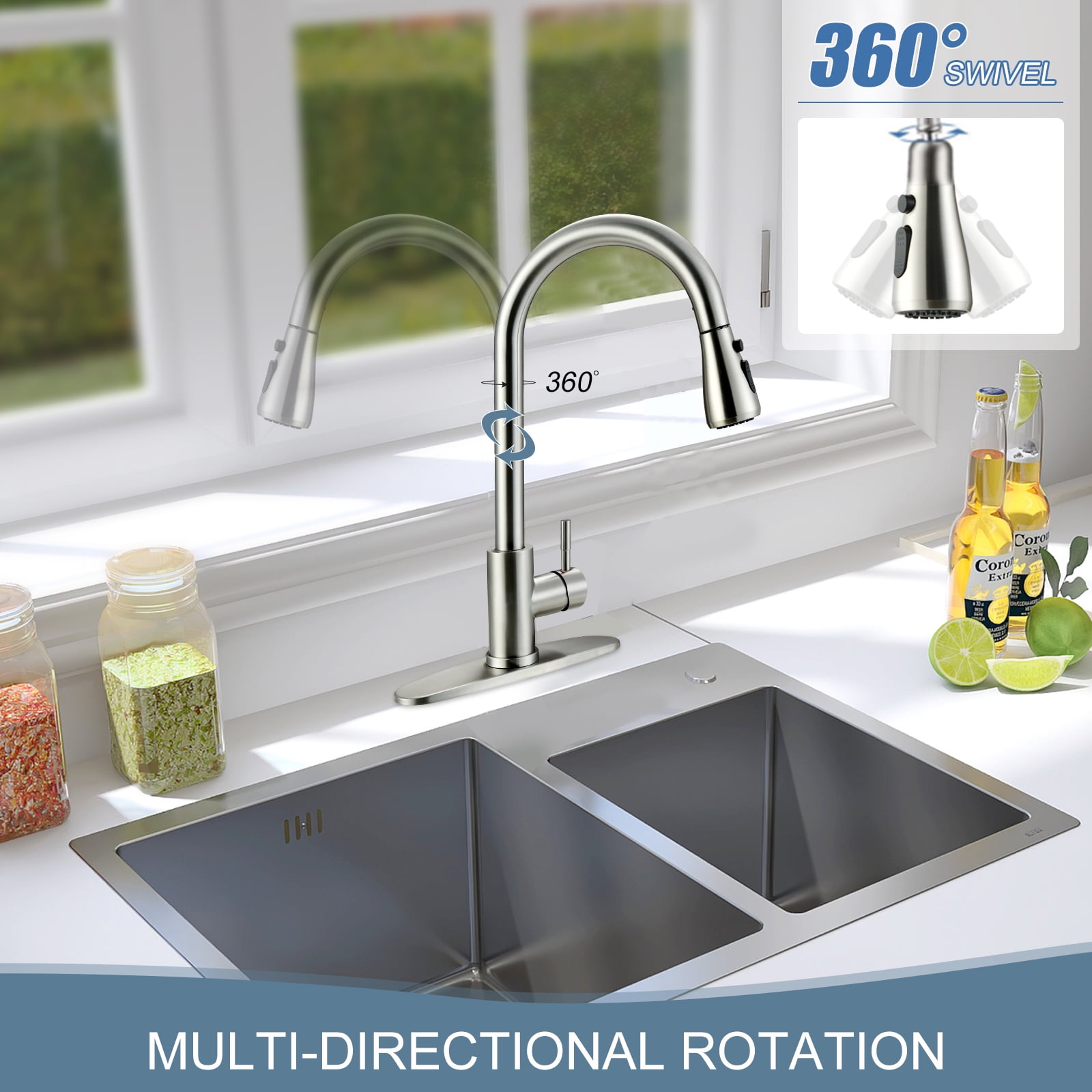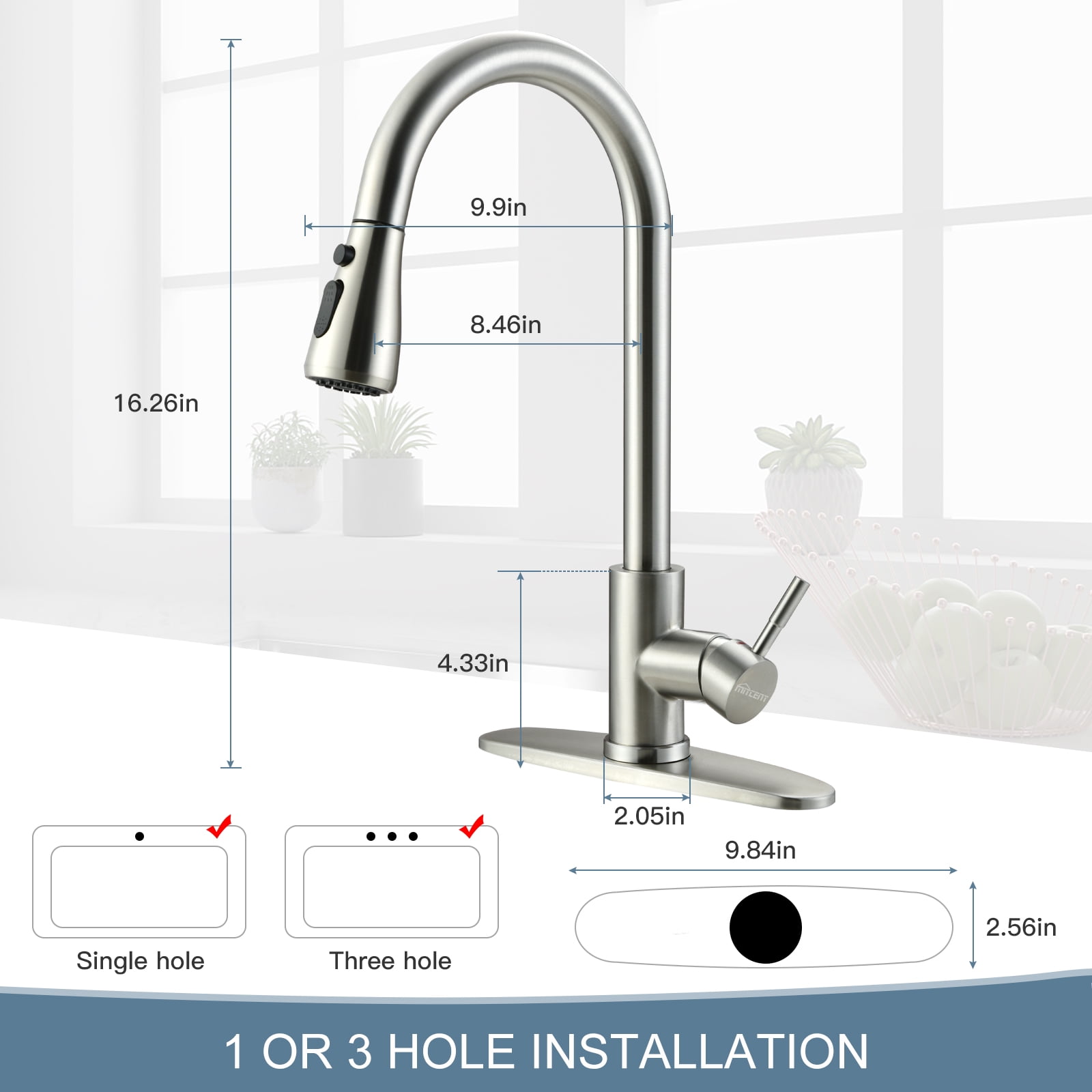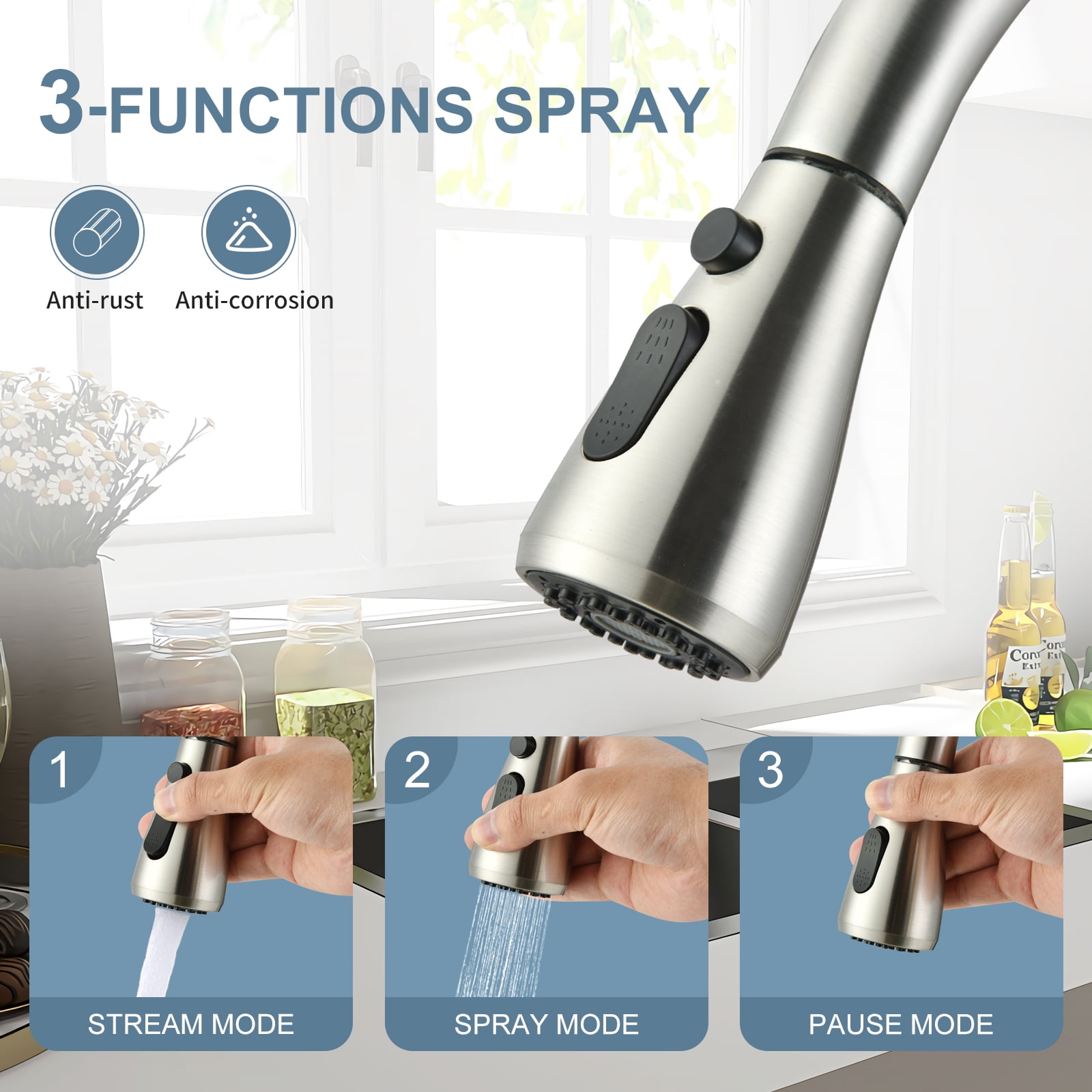 This Mitcent pull-down Single Handle Spray Kitchen Faucet allows you choice stream and spray for all your modern kitchen needs. The faucet is made of pure 304 stainless steel in brushed nickel, brass inner components. The pullout sprayer takes 360 degree connector, more flexible and durable.It can adjust water pressure and temperature with the integrated single handle kitchen faucet, with 3 setting modes. All needed hardware and manual are included in the package. Easy to install with a wrench, no need plumber, save money and time, finish DIY installation less than 20 minutes. Easy to Maintenance: Superior corrosion & rust-resistant finish prevent dirty from sticking to faucet surface.It coves 2 years limited warranty.