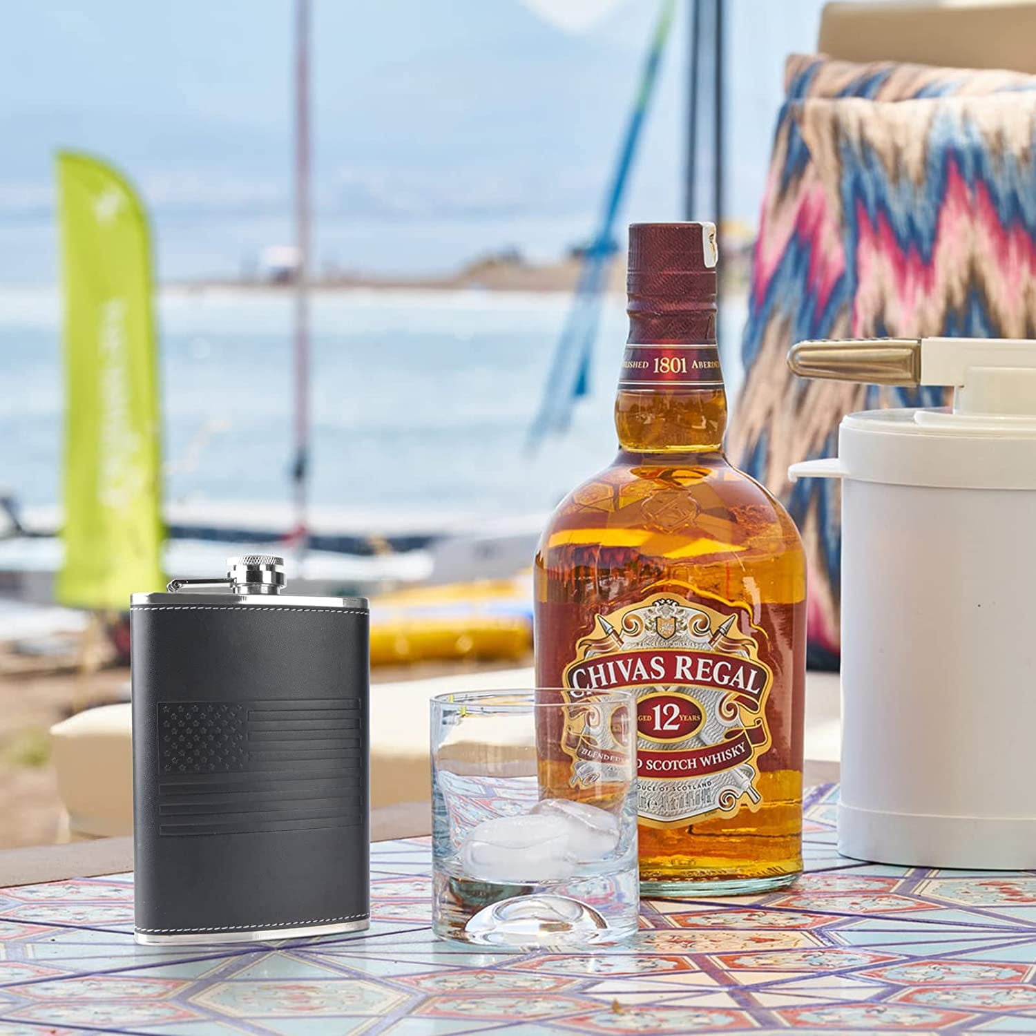 - 【CLASSIC FLASKS】Hip flasks for liquor for men adopts U-shaped design, making it contoured to fit your body more comfortably very convenient for the person to carry,store and hide. The black leather American flag flasks look is more suitable for men.