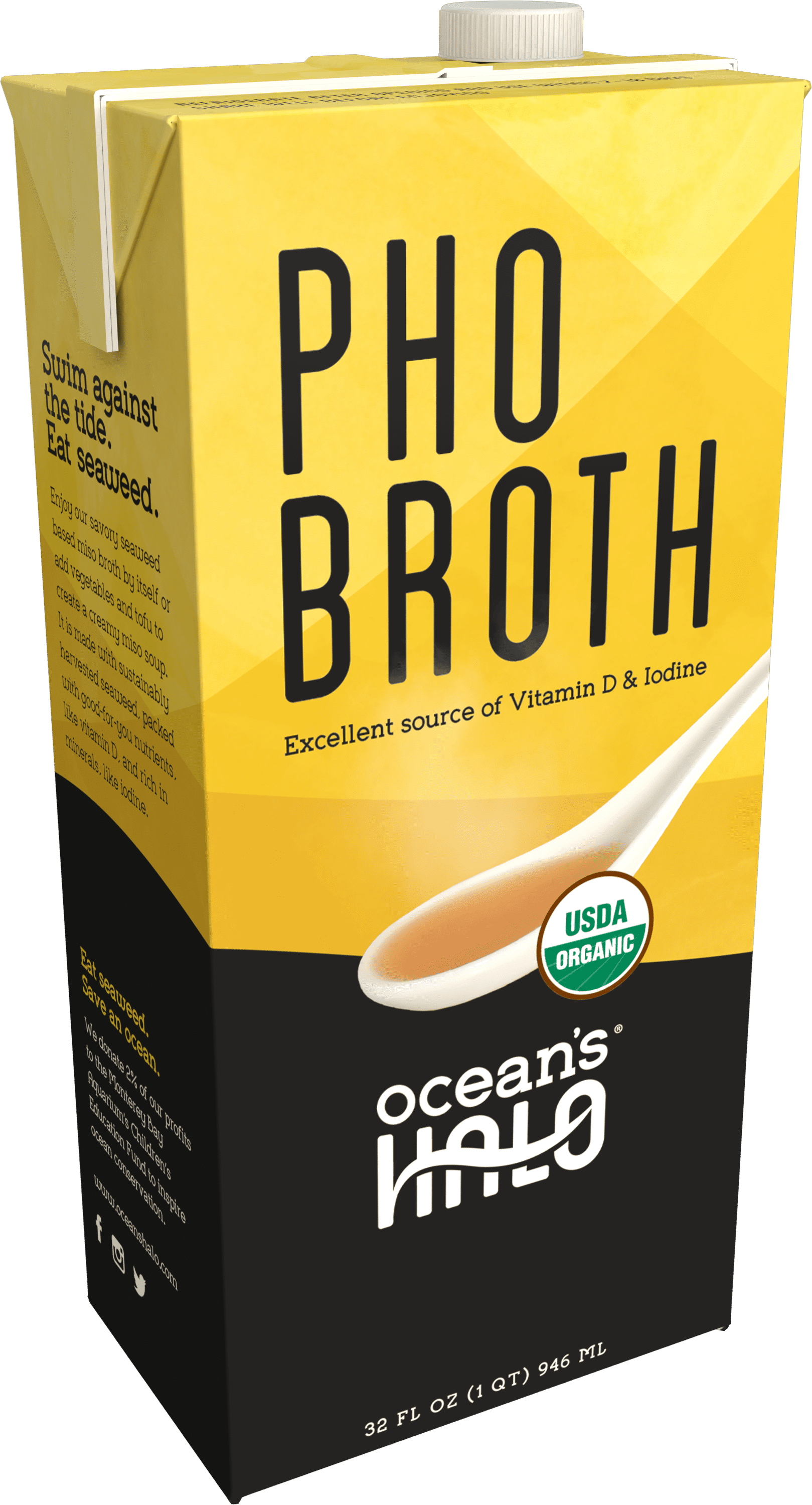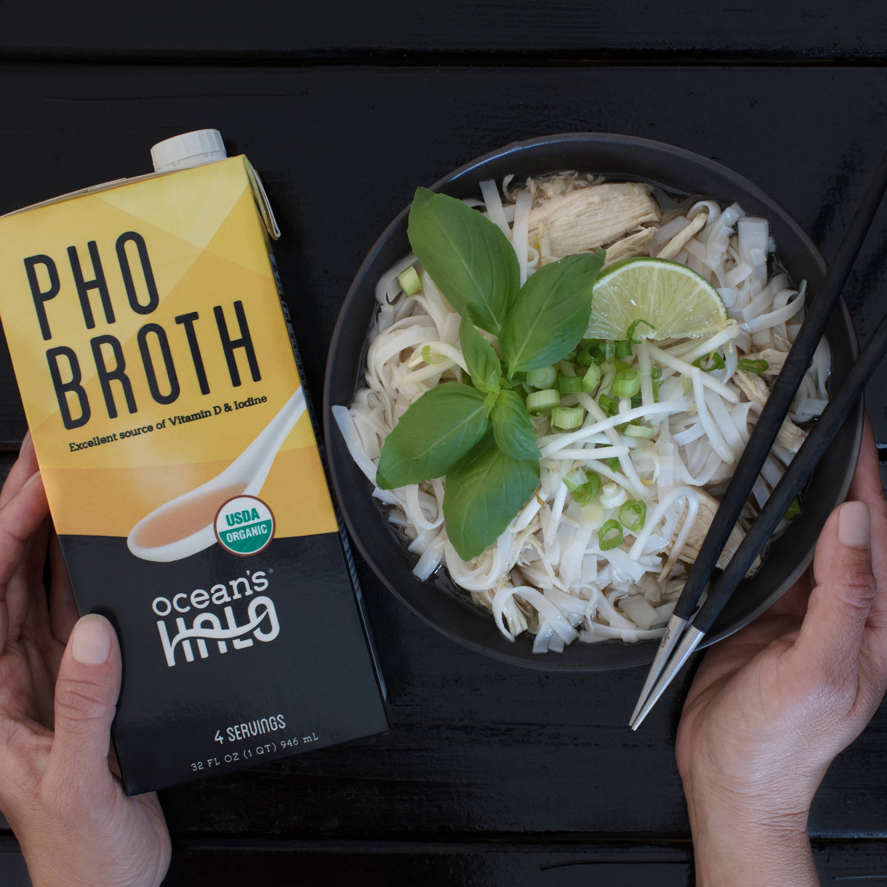 • USDA Organic• Certified Vegan• Gluten-free• Non-GMO• Authentic Flavors• Includes sustainably farmed kelp• Excellent Source of Vitamin D and Iodine• Learn more at oceanshalo.com2 Units of 32 oz Organic and Vegan Pho Broth by Ocean’s Halo. This delicious kelp-based broth is loaded with authentic flavors while delivering vitamins, minerals, and protein! USDA Organic GF Ingredients, & Vegan.Ocean’s Halo Organic and Vegan Pho Broth, 2 Pack, 32 oz. per Unit