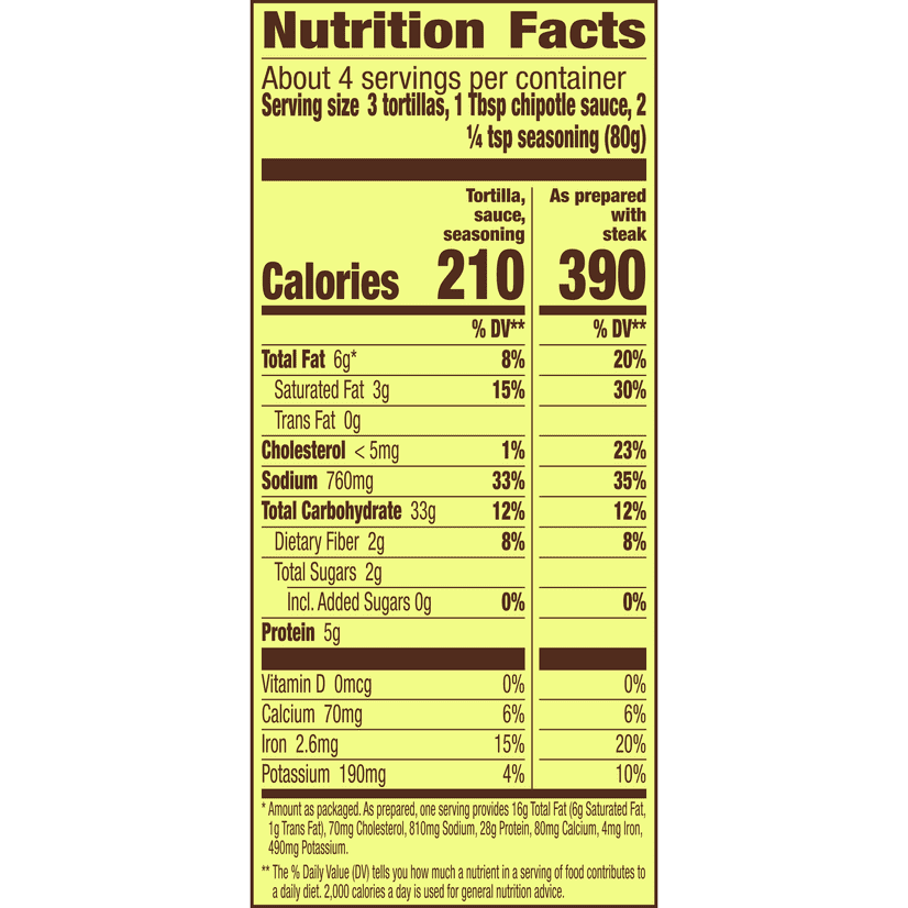 - KIT INCLUDES: 12 Street Taco flour tortillas, Mild Carne Asada seasoning mix, and Medium Creamy Chipotle sauce.