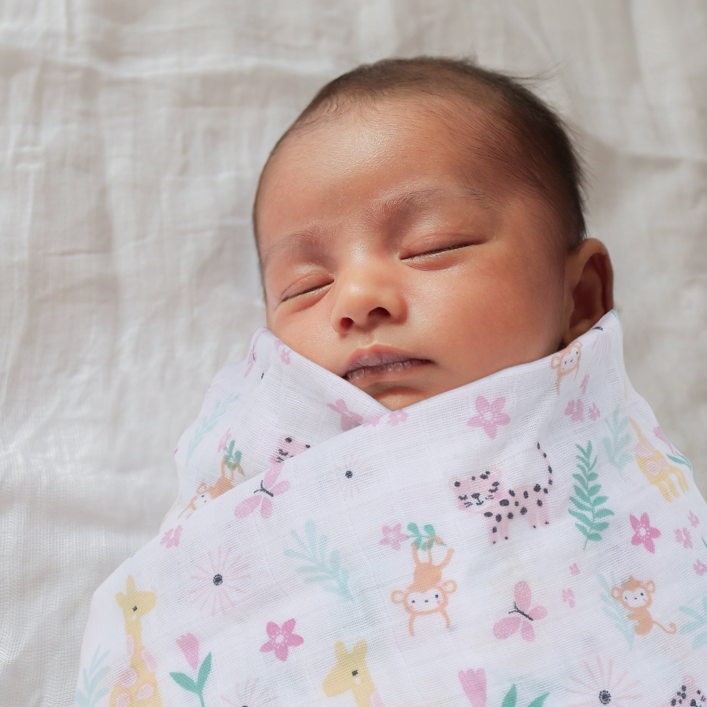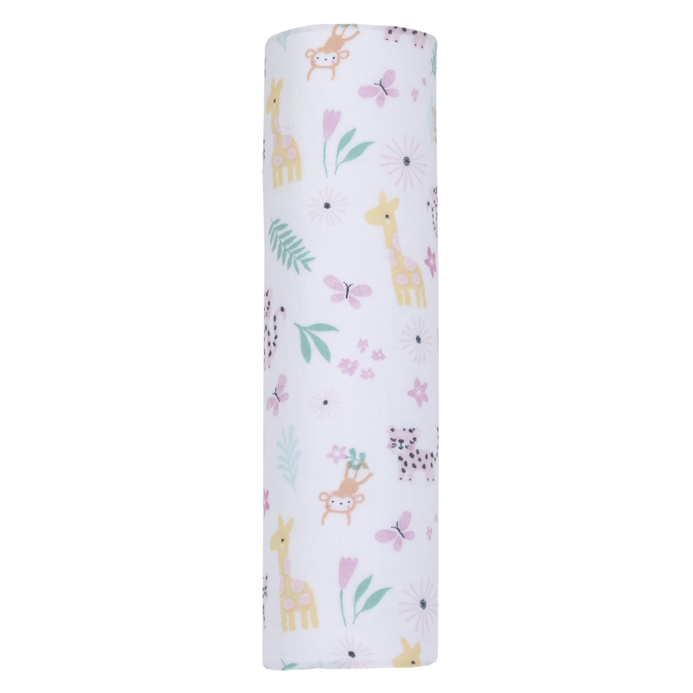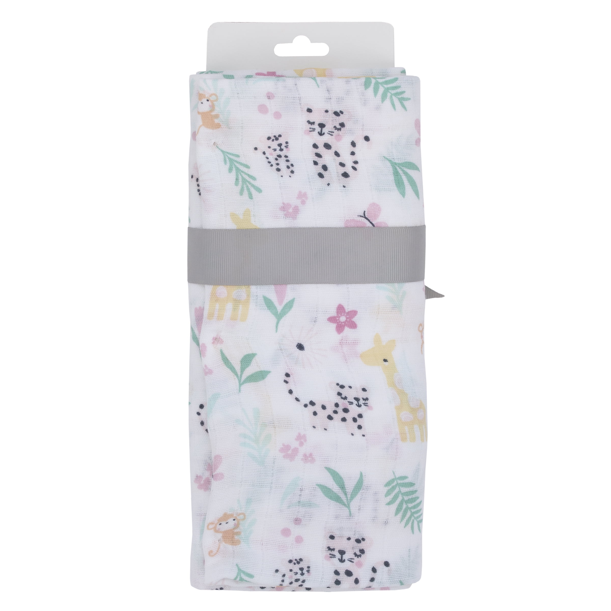 Muslin swaddles come in handy for so many uses, and this blanket is the perfect choice to use for swaddling, as a nursing cover, as a light blanket, or when on-the-go. The darling jungle print features playful cheetahs, a monkey and giraffes among a botanical background of leaves and flowers, all in girly shades of pink, green, lavender and white. The extra large 47" x 47" size makes this blanket the perfect size for swaddling your little one. The 100% cotton muslin fabric ensures that it is soft and comfortable next to baby’s skin.