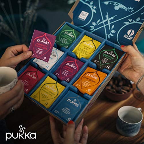 We have dedicated a lot of time to creating this beautiful herbal tea bag variety gift box of 45 tea bags. It’s made in the UK and uses paper that is recycled and FSC certified – it’s even glued it together with specially selected vegetable-based glues. The foil on the outside uses a new zero waste to landfill foil scheme – to help pioneer sustainable use. The tray inside might look a little patchy, but only because it’s a combination of paper fibres and starch. You can put it in the home paper recycling or home composting. Even the band on the outside is made from FSC certified paper and is fully recyclable. All designed to make the box itself as beautiful as possible for you and the planet as the teas that sit inside it. At Pukka, our heartfelt desire is to create a healthier, happier world through the incredible power of organic herbal teas. We hope you feel inspired to discover more about yourself and the beautiful planet on which we all live. Doing good things helps make good things happen. We create things that help you, help nature and everything in-between. It’s called conservation through commerce – striving to positively change the world for you, business and the planet. We are a B Corp organization, giving back 1% for the Planet, Fair for Life and FairWild certified45 Sachets of incredible organic HERBAL Teas selected from the Pukka range Supreme matcha green – revitalize – Turmeric active – elderberry & Echinacea – Three ginger – Peppermint & Licorice – relax – Night time – Lemon, Ginger & Manuka Honey Bring these incredible herbs alive by infusing in freshly boiled water for up to 15 minutes 100% organically grown and ethically sourced ingredients. Vegetarian, Kosher and non-GM We are proud to be 1% for the planet. The packaging comes from renewable sources and is recyclable An assorted collection gift Set of individually wrapped specialty Pukka teabags, nine different varieties mixed in one box
