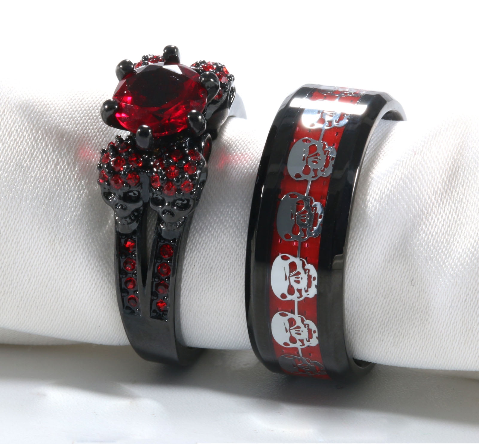 - Black and red couple rings:Red aaa cz wedding ring for women ,skull ring for men and women