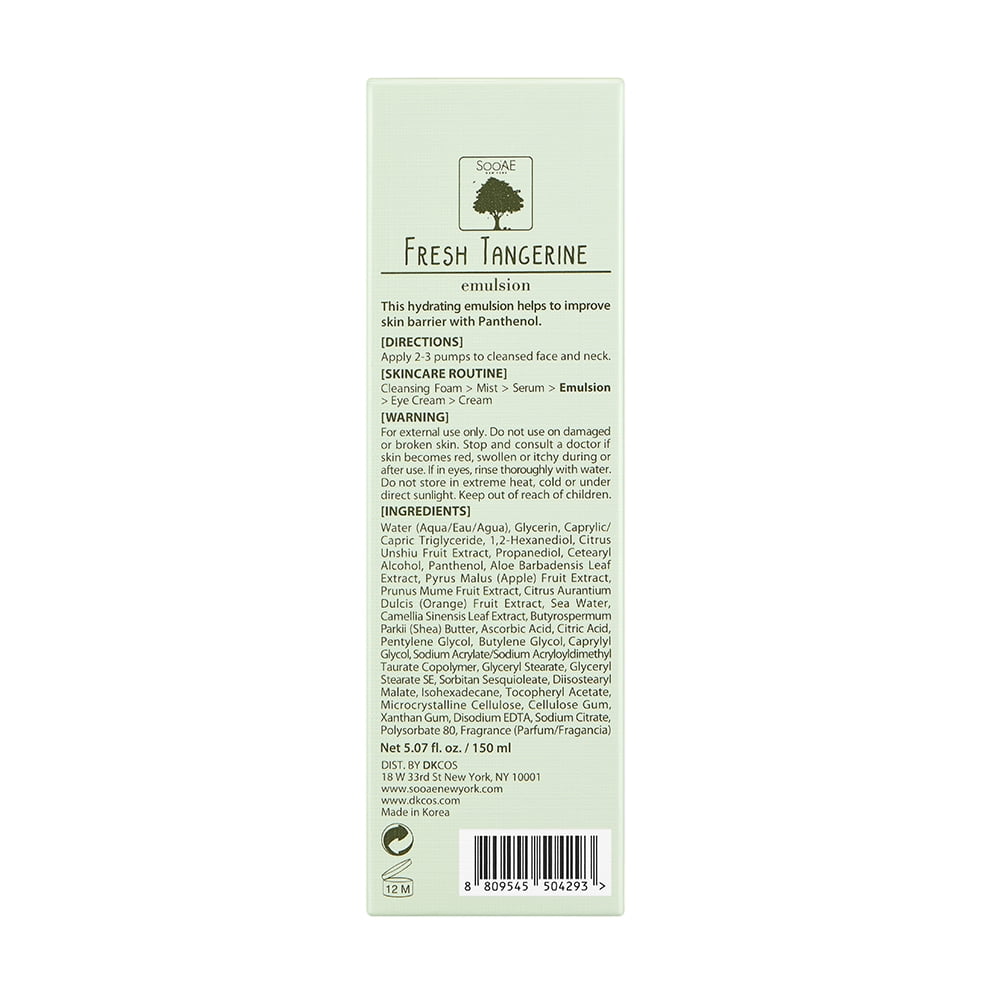 The vitamins of young tangerine protect skin from active oxygen. Rich in vitamin C helps in collagen synthesis.Rich in minerals containing calcium and magnesium, moisturizes the skin. It is a soft emulsion that matches skin oil balance.Skin Type: Oily Skin, All Skin TypeTexture: Light Watery TextureMain Ingredient: Young TangerineMain Effects: Revitalizing & RefreshingSoo’AE Fresh Tangerine Face & Neck Emulsion – For Healthy, Younger Skin 5.07 fl.oz./150ml Full Size