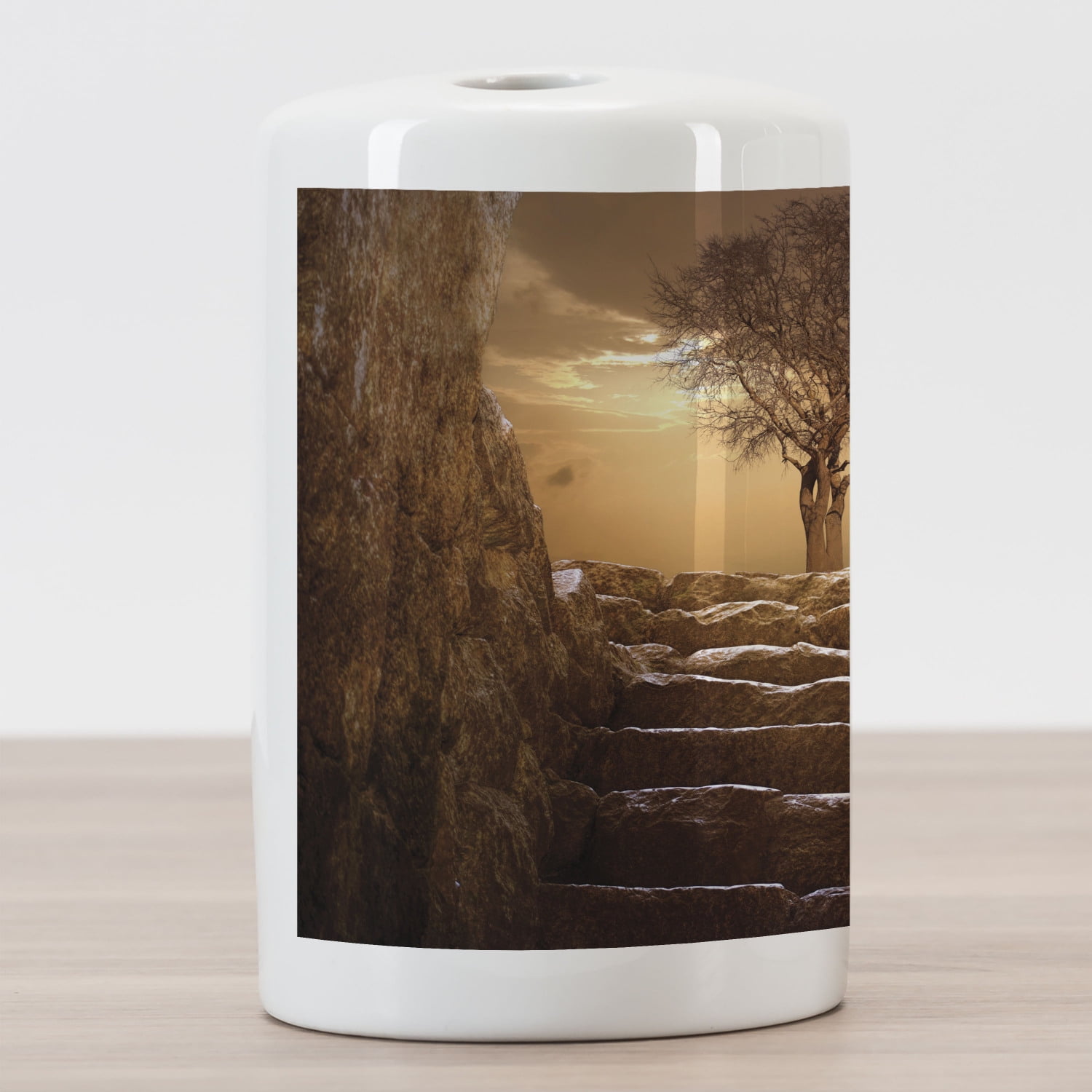 SIZE – 4.5" height and 2.7" width. Large enough to fit multiple toothbrushes, up to 4. MATERIAL – White glossy ceramic. Durable and sturdy. Heavy enough to stand still when filled. FEATURES – Machine washable, easy to clean. Multipurpose decorative countertop organizer cup. VERSATILE – A great solution to storing your toothbrush, makeup tool, toothpaste, tweezers. PRINTED – Wrap-around high technology patterns. Proudly designed & printed in the USA. Create a tidy and complete look for the bathroom with this toothbrush holder. This glossy ceramic cup will help you to organize your countertop, nightstand, desk vanity, dresser, or table. You can organize your toothbrushes, toothpaste tubes, combs, clippers on a bathroom top. You don’t have to use this holder in bathroom decor; you can also create tidy and refine looks for the kitchen, office, or bedroom. Storage your tablespoons, brushes, shredders, and all types of silverware with this ceramic organizer cup. At the office or craft room, organize your pen & pencils, paintbrushes, or all types of office supplies. You can also design a chic and clean look for your bedroom to keep all your makeup utensils, eyeliners, and many more cosmetics. You can easily find a matching print from our thousands of patterns. Generate a simple, clean, and fun appearance to goes well with any concept or theme. This multipurpose and decorative toothbrush holder safe space and holds enough tools with its perfect design size. It can be a thoughtful gift as well as being a smart choice for everyday use. This durable material is dishwasher safe & easy to clean. Material is heavy enough to stands still when filled with toothbrushes. This toothbrush holder organizer offers a fresh, useful, and tidy glance for your everyday decor. The digital images we display have the most accurate color possible, however, due to differences in computer monitors, we cannot be responsible for variations in color between the actual product and your screen.Tree Ceramic Toothbrush Holder, Treet Entrance with Stone Stairs Sun Rays Cloudy Sky Winter Landscape Monochromic View, Decorative Versatile Countertop for Bathroom, 4.5" X 2.7", Brown, by Ambesonne