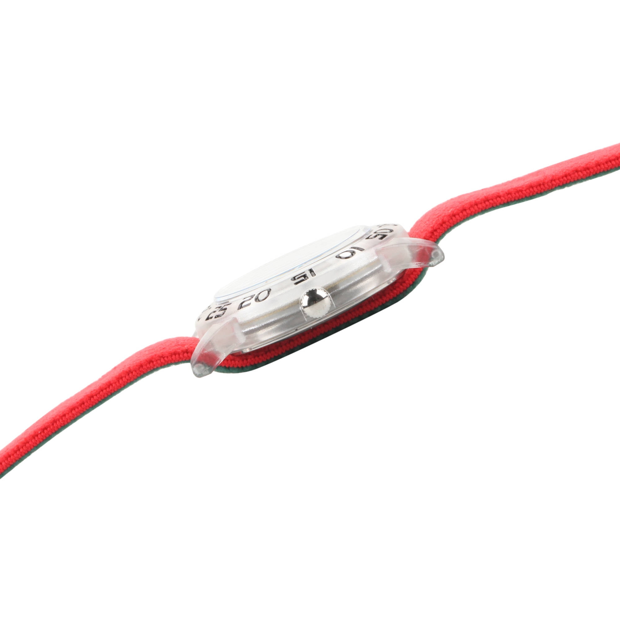 This Disney Mickey Mouse, Dumbo, Mike Wazowski and Snow White Girls’ Clear Plastic Time Teacher Watch features a reversible red and green nylon strap.