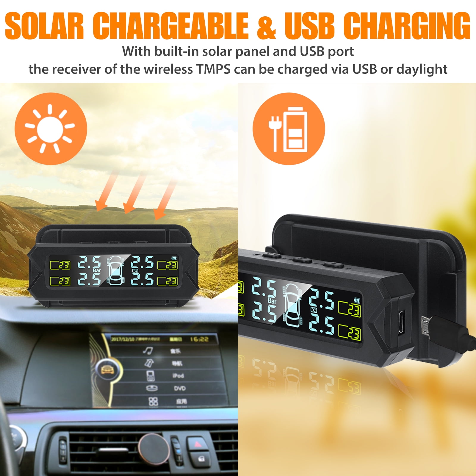 Tire pressure monitoring system has six-alarm modes boasts accurate data, real-time display. Fast leak alarm, slow leak alarm, high pressure alarm, high temperature alarm, sensor fault alarm and sensor battery low power alarm, ensure safe driving. With wireless transmission technology, it will warn immediately when the sensor detects abnormal tire temperature or pressure. The wireless solar pressure monitor range is 1.5- 5.6 Bar/22 -81Psi. An intelligent tire pressure monitor can be placed on the windshield and center console, you don’t need look down when driving, it doesn’t block your eyes. Easy to see big screen while driving, with a buzzer to alert the driver. Tire pressure monitor built-in solar panel and USB port, the receiver of the wireless TMPS can be charged via USB or daylight, ensure the tire pressure monitoring system will work continuously. No need charge it for long time, and do not occupy your car cigarette lighter socket. Wireless transmission design and 4 cap external sensors make the car tire pressure monitor easy to install on your vehicles, no need to disassemble your tires.