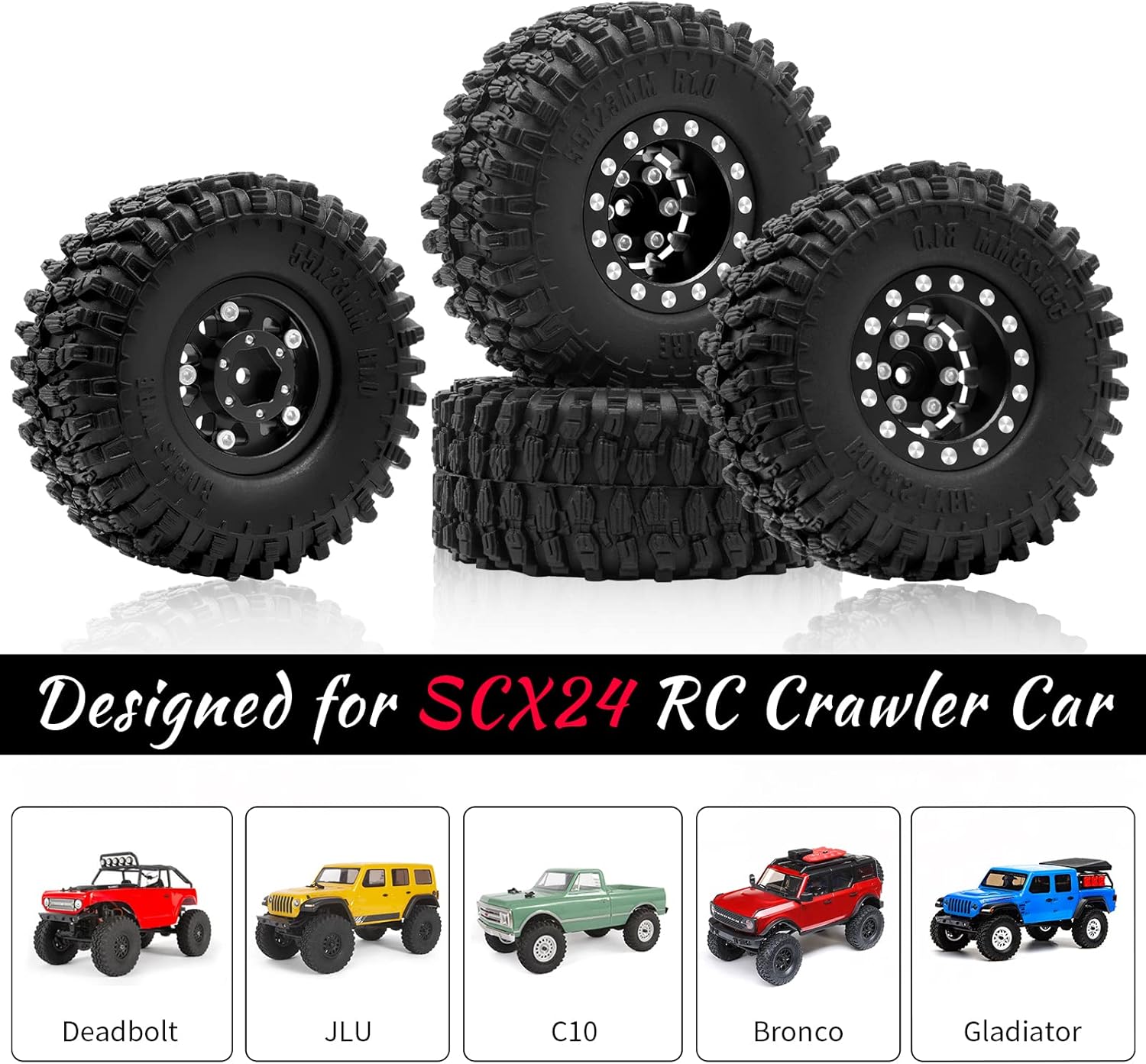 0″ Wheel and Tires Color: Black/Red/Orange/Green/Rose Red Quantity: 4Pcs/Set Material: OGRC SS-compound, Aluminum Alloy Single Weight: 29g/PC Gross Weight: About 128gPackage list: 4 * 1.