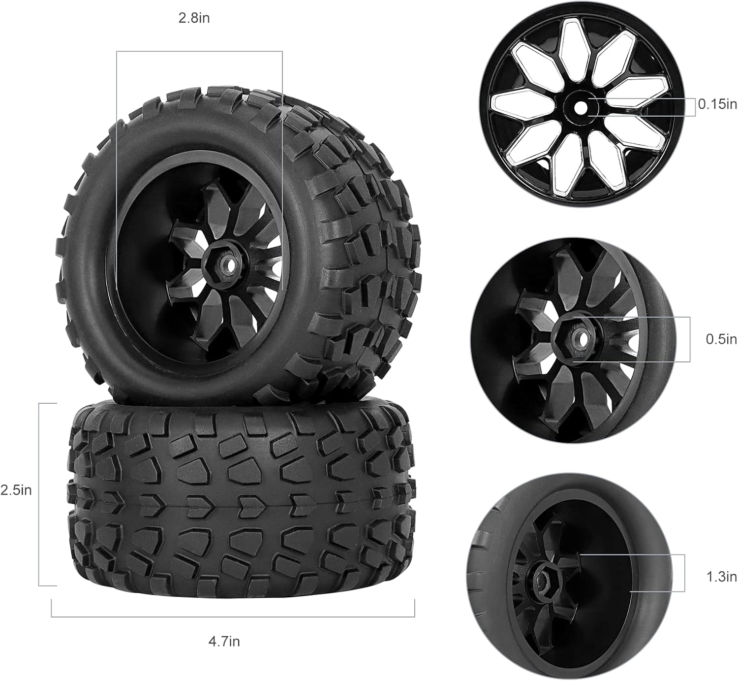 • 12mm Hex RC Tires and Wheels Size: The size of our 1/10 RC buggy tires, Outer Diameter: 5.11″ | Width: 2.8″ | Hex Size: 12mm. “Please make sure our RC tires and wheels are the correct sizes you are looking for, to avoid the returns products and save your time due to the inconsistent size.”