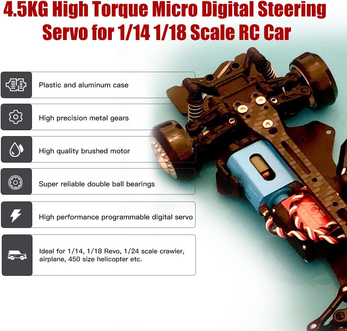 FeatureHigh performance digital servoPlastic and aluminum caseSuper reliable double ball bearingsHigh precision metal gearsHigh quality brushed motor2S high voltage compatible micro servoProgrammable digital circuitIdeal for 1/14, 1/16 Revo, 1/18, 1/24 scale crawler, airplane, 450 size helicopter, robot etc.