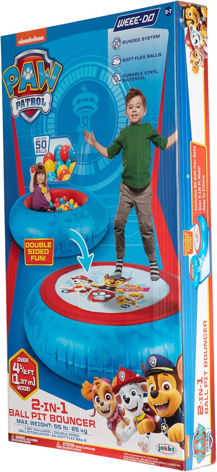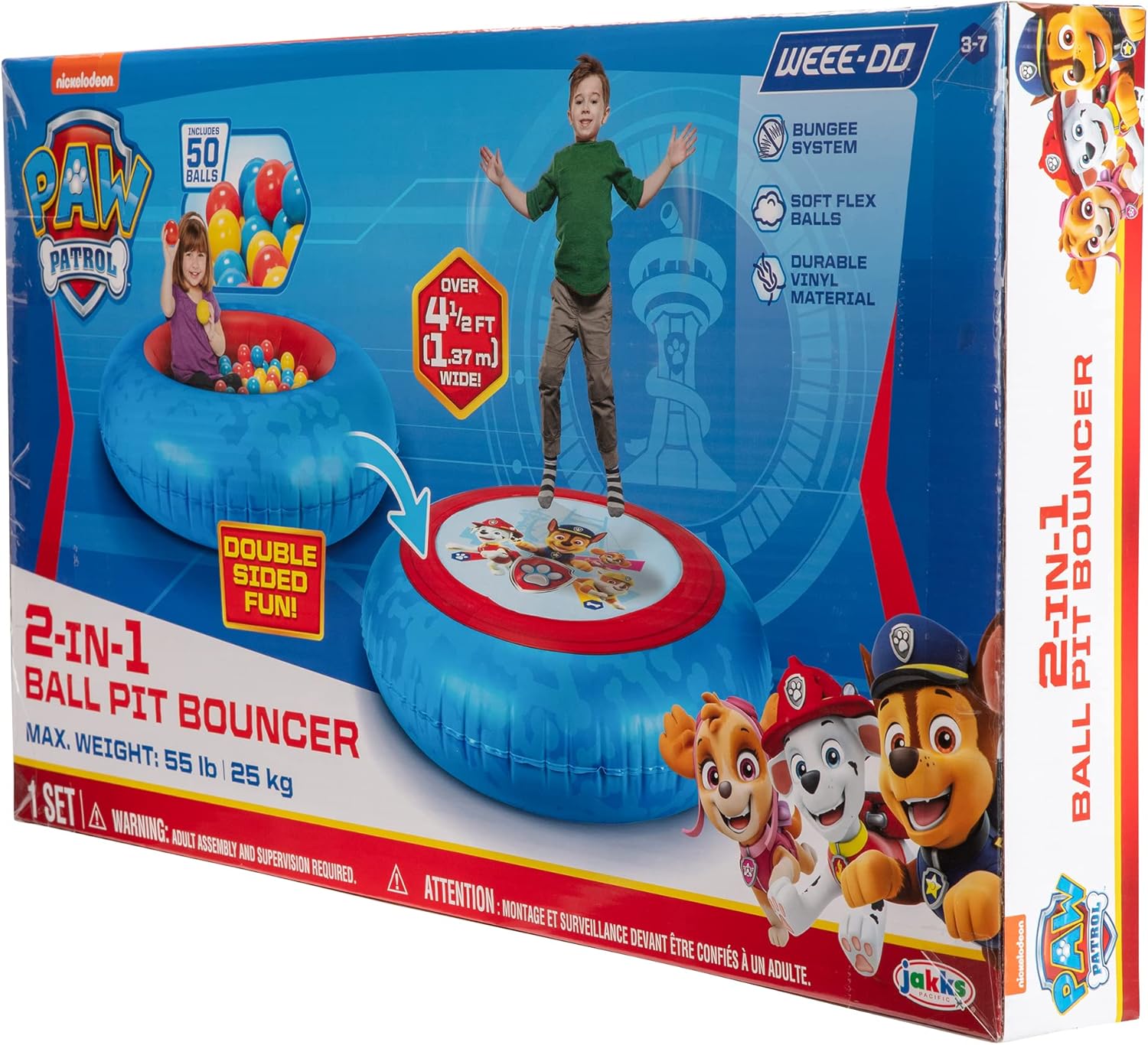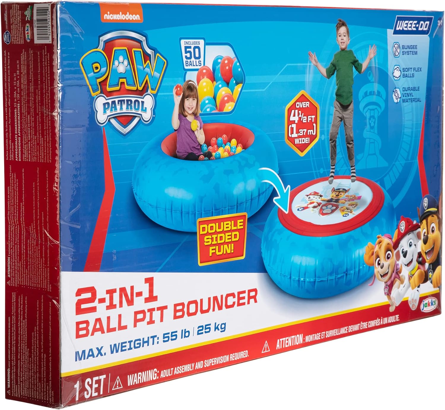 Paw Patrol 2-in-1 Ball Pit Bouncer for hours of endless fun! Bounce, bounce, bounce with your favorite Paw Patrol friends with this oversized bouncer featuring a safe bungee system and graphics from your favorite Paw Patrol characters.