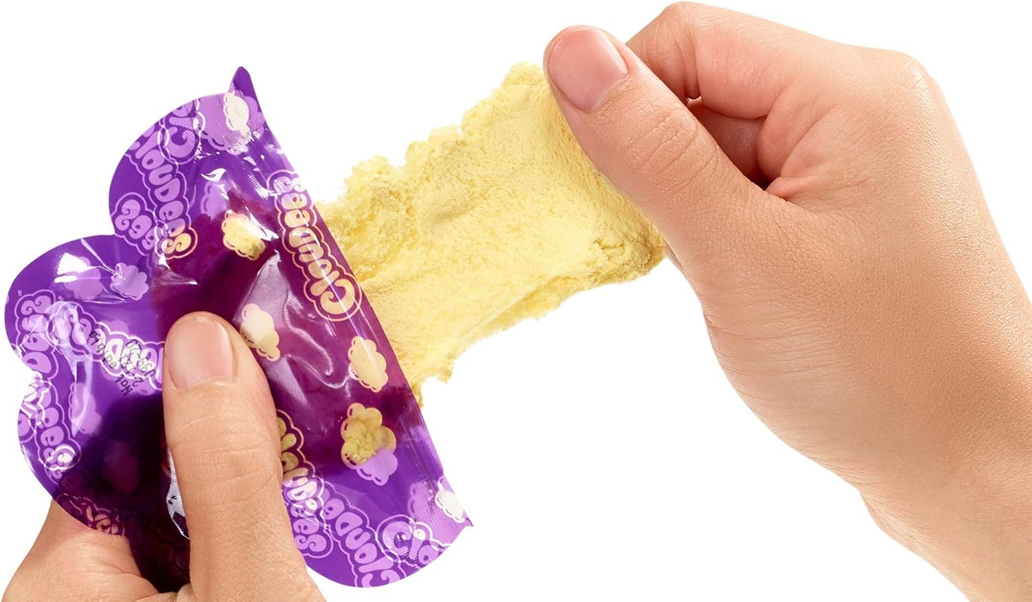 Set includes two colors of fluffy, reusable cloud dough that never dries out, so kids can scoop, press, smush and shape the dough to make ice cream cups, “cook” special cakes and mold any other shapes they can imagine! Dough can be stored in some of the included accessories for safe keeping.