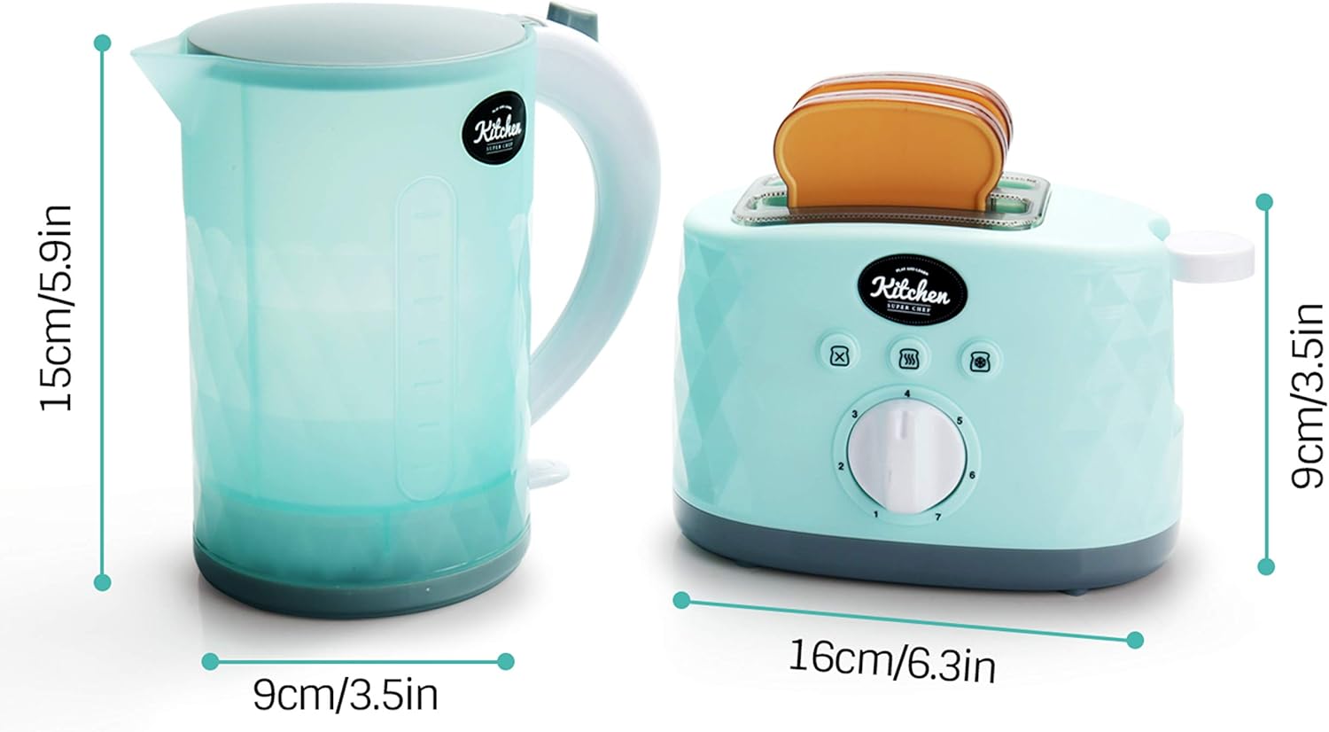 specification: · material: pp · batteries: Required 2AAA batteries (included) · recommend age: 3 years+ · a brand new Stylish diamond design kettle and toaster Setter> · Kettles hinged lid for easy filling> · Kettles has light and sounds> · Mechanical pop-up Toaster> · real sound effects when the toast pops Up · includes 2 pieces of toast what you get: 2x toast 1x Toaster 1x kettle