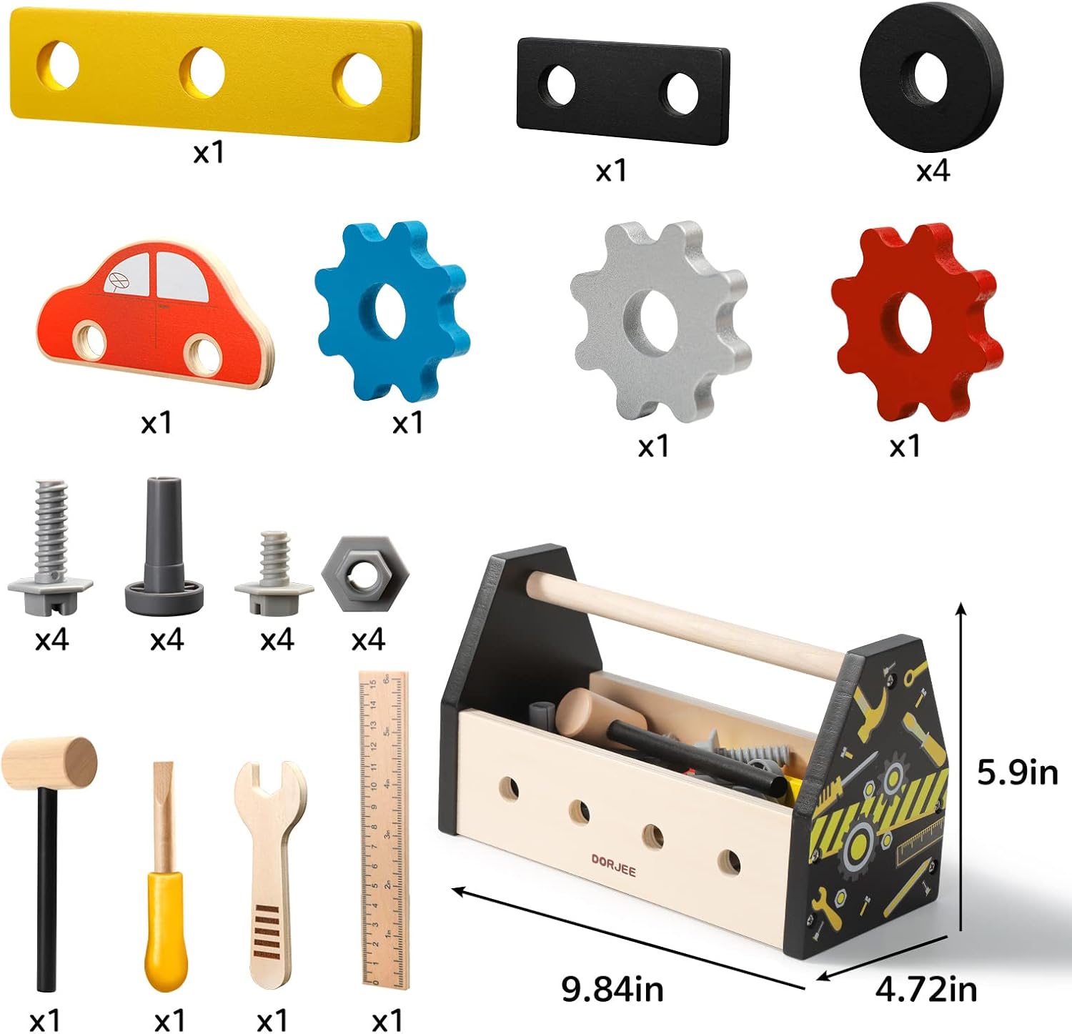 COMPLETE TOOL KIT:This all-in-one tool box for kids includes everything they need to play and learn, from a toy hammer, a screwdriver, a ruler, a wrench to 12 nuts and bolts, 4 nails, 3 gears, 1 car, 4 wheels and 2 wooden boards with holes. With realistic colors and patterns, it”s perfect for imaginative playtime!